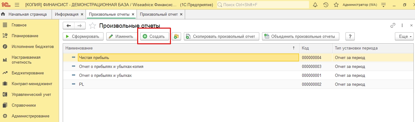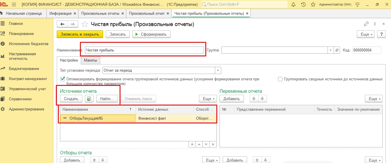 Рассмотрим пример расчета чистой прибыли в WA:Финансист. Данный показатель можно рассчитать в блоке «Бюджетировании», раздел «Настраиваемая отчетность». Для этого пользователю необходимо настроить отчет. Плюсами данного раздела является возможность создавать отчеты по шаблонам пользователя с расчетом всех необходимых показателей. В данном отчете можно формировать плановые и фактические данные.