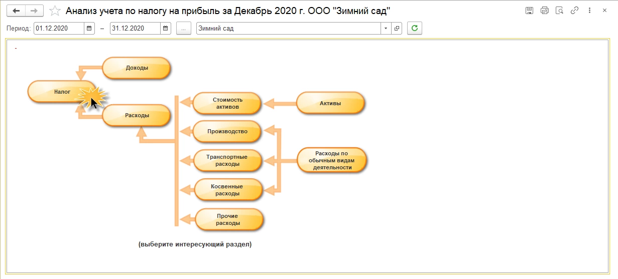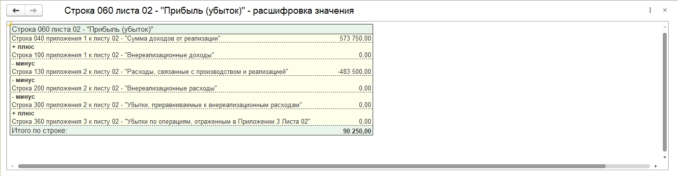 Некоторые ячейки отчета можно расшифровать и посмотреть детализацию, нажав на них мышкой. Пользователь увидит, из чего складывается прибыль до исчисления налога, ее составляющие.