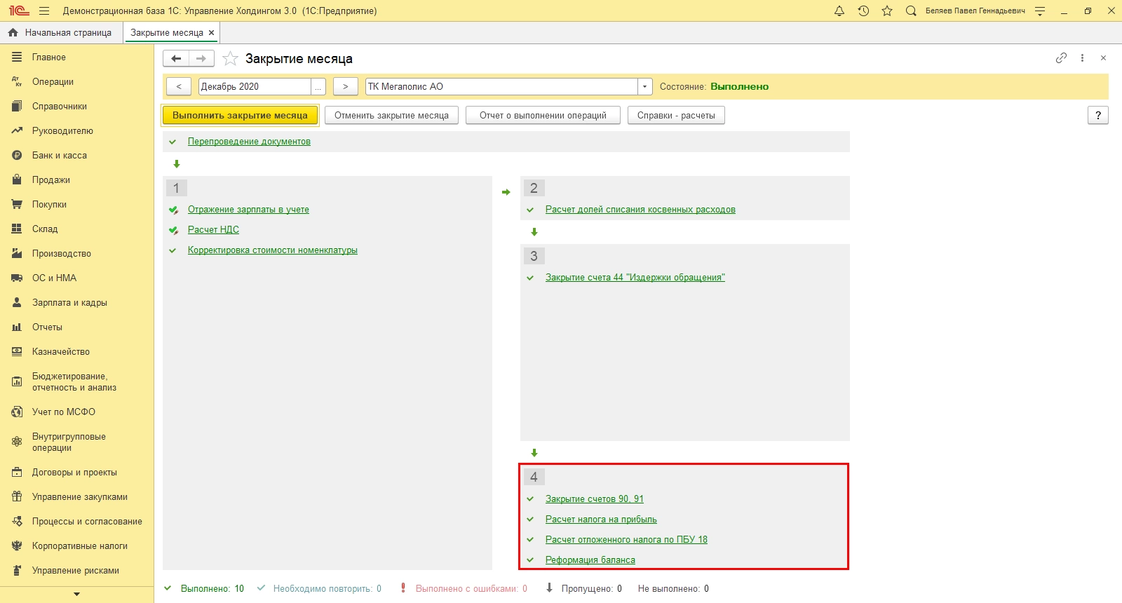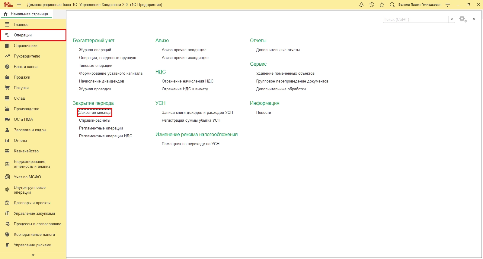 Точный учет чистой прибыли в холдингах на базе 1С:Управление холдингомКак и в 1С:ERP, чтобы определить финансовый результат деятельности компании и рассчитать сумму налога на прибыль, в 1С:УХ выполняем перечень операций по закрытию месяца, для чего перейдем в раздел «Операции» - «Закрытие месяца».