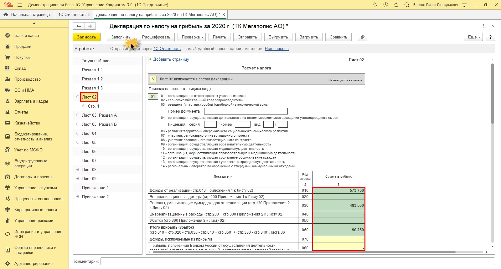 Заполним отчет по кнопке «Заполнить». Перейдем на «Лист 02». В таблице показаны показатели для расчета прибыли и суммы рассчитанного налога.