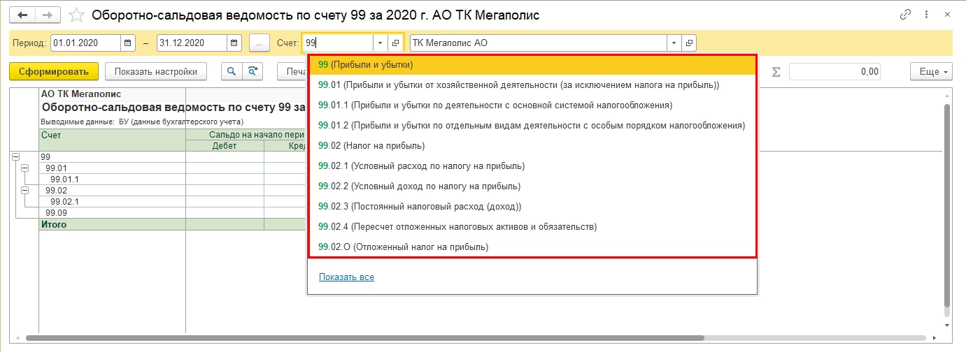 Используя стандартный отчет «Оборотно-сальдовая ведомость» (ОСВ) из раздела «Отчеты», можно также посмотреть обороты счетов по определению чистой прибыли и ее значение.