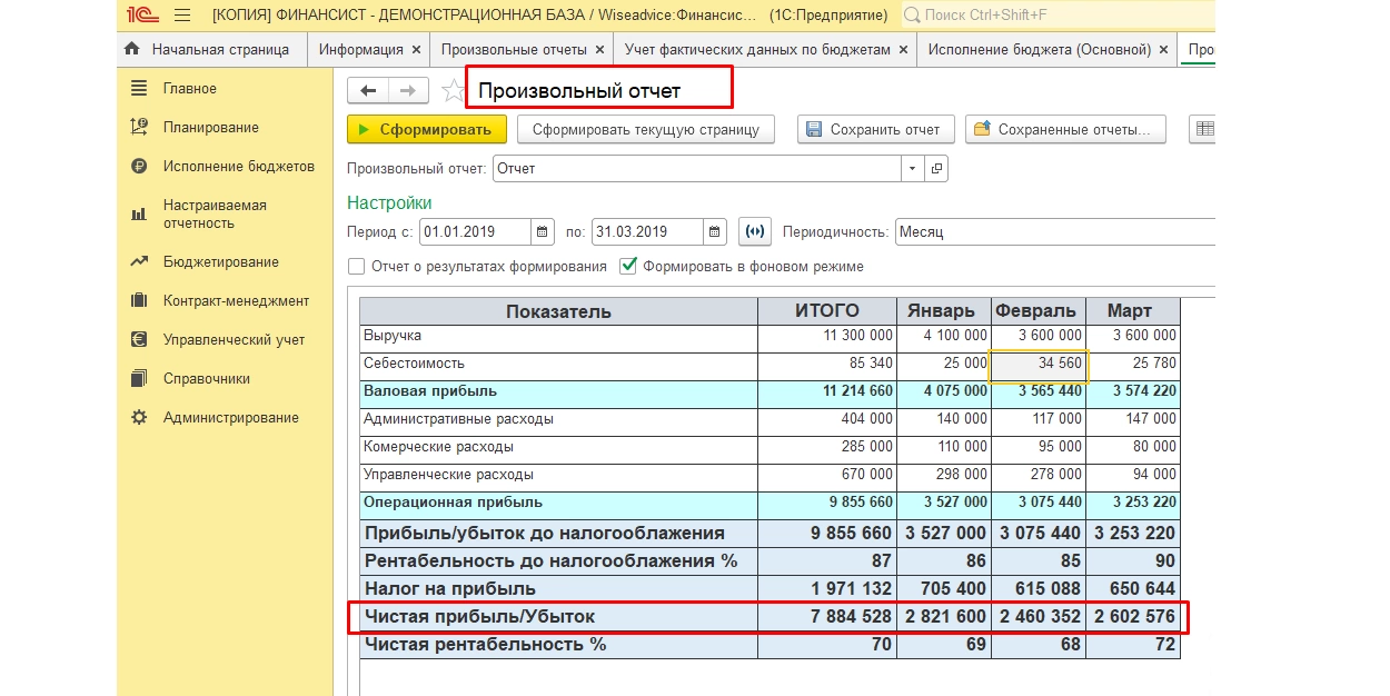 Используя отчеты и инструменты 1С:ERP, 1С:УХ и WA:Финансист пользователь может анализировать финансовую деятельность предприятия, изучать показатели, задействованные в расчете прибыли, и рассчитывать чистую прибыль.