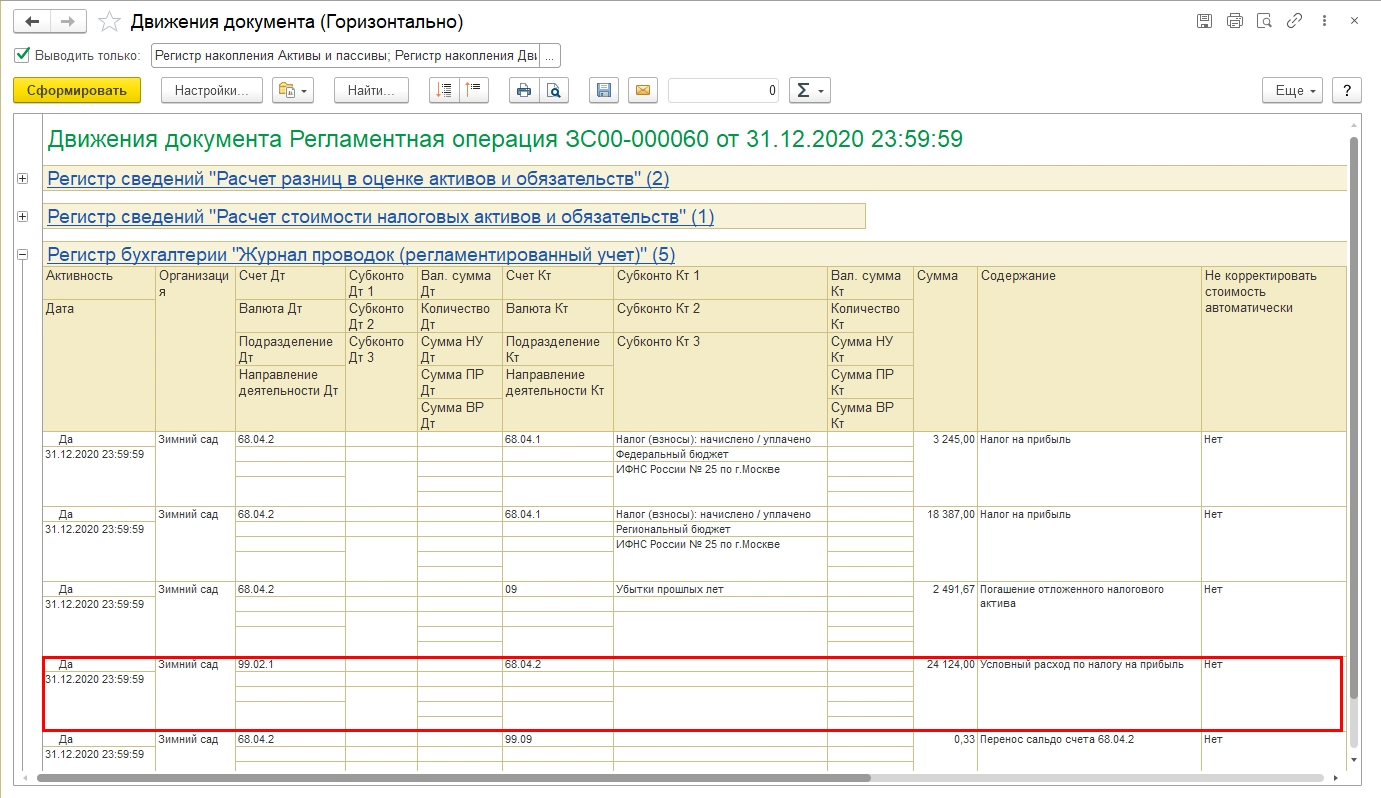 Документом «Расчет налога на прибыль» отражена запись начисления налога на прибыль – «Условный расход по налогу на прибыль»:
