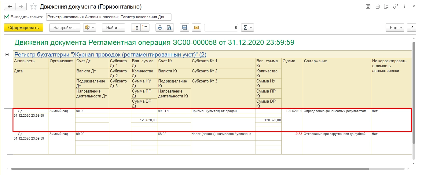 В нашем примере показатель прибыли организации ООО «Зимний сад» с учетом всех доходов и расходов за декабрь 2020 года составил 120.620 руб.
