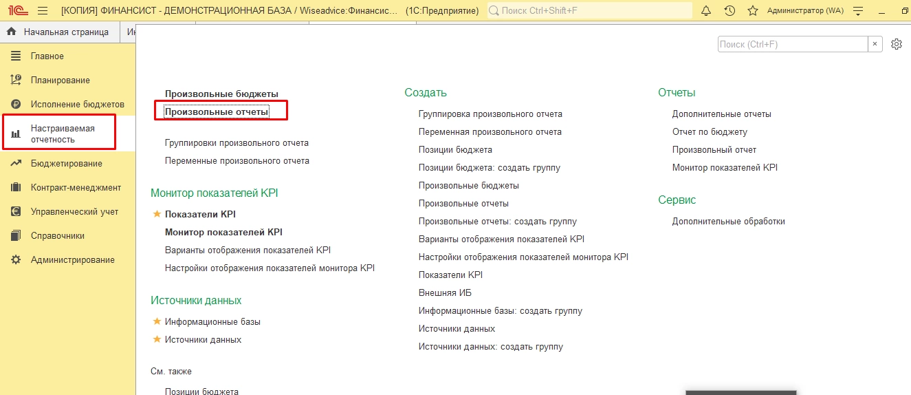 В Разделе «Настраиваемая отчетность» в форме списка «Произвольные отчеты» создадим необходимый отчет.