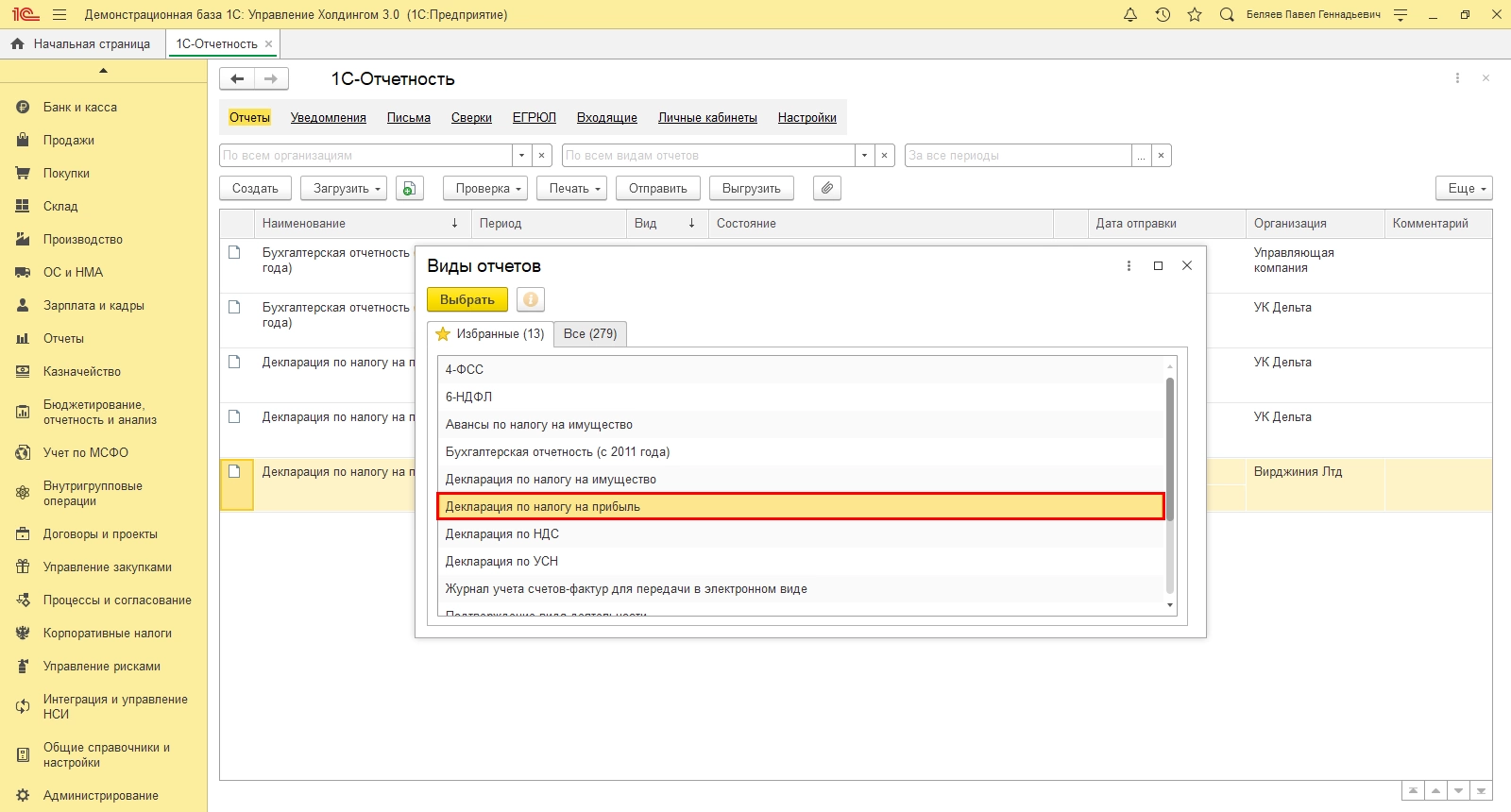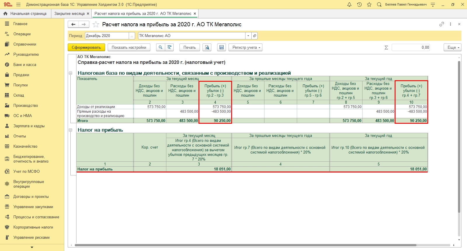 Интерфейс и разделы меню программы 1С:Управление холдингом несколько отличаются от 1С:ERP. Он больше напоминает 1С:Бухгалтерия 8.3. Рассмотрим примеры формирования отчетов по прибыли на примере организации ТК «Мегаполис».
