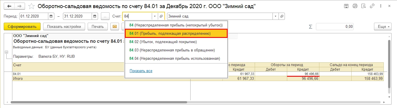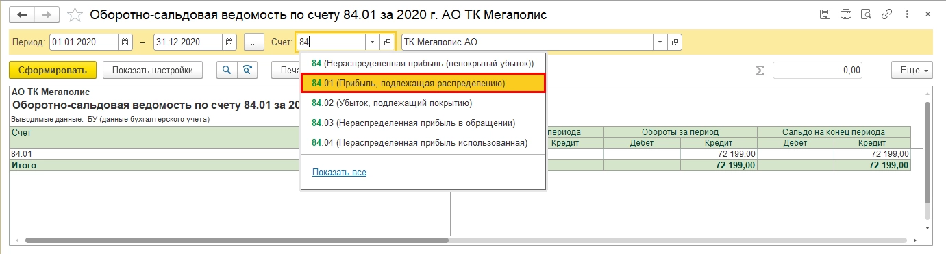 Эту же информацию можно получить, используя стандартный отчет «Оборотно-сальдовая ведомость по счету», указав счет 84.01 «Прибыль, подлежащая распределению».