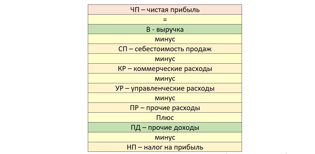 ЧП = В – СП – КР – УР – ПР + ПД – Н - НП