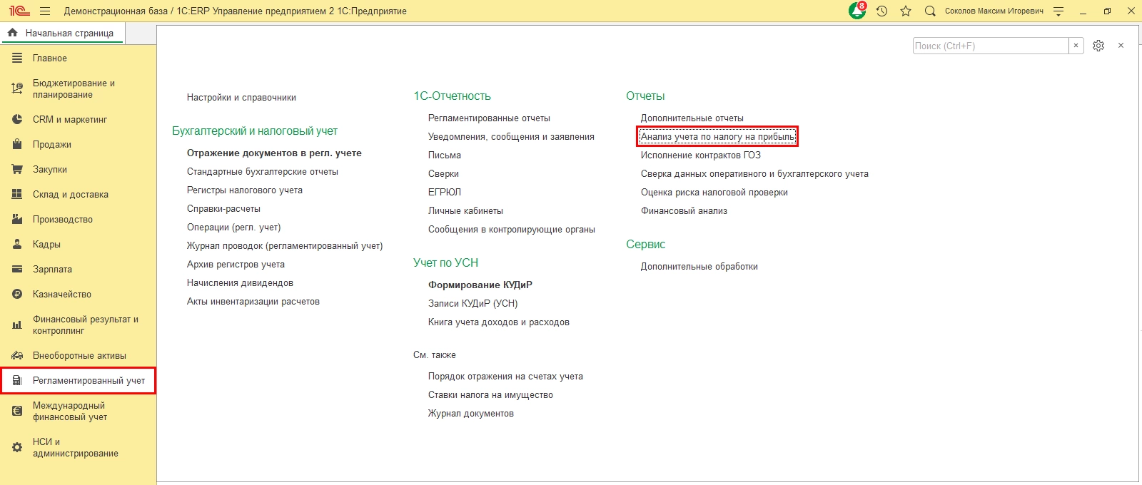 1С:ERP - инновационное решение для учета чистой прибыли и других финансовых результатовДля наглядного отображения анализа данных расчета чистой прибыли в 1С:ERP имеется инструмент «Анализ учета по налогу на прибыль», которым можно воспользоваться, перейдя в раздел «Регламентированный учет» по ссылке «Отчеты».