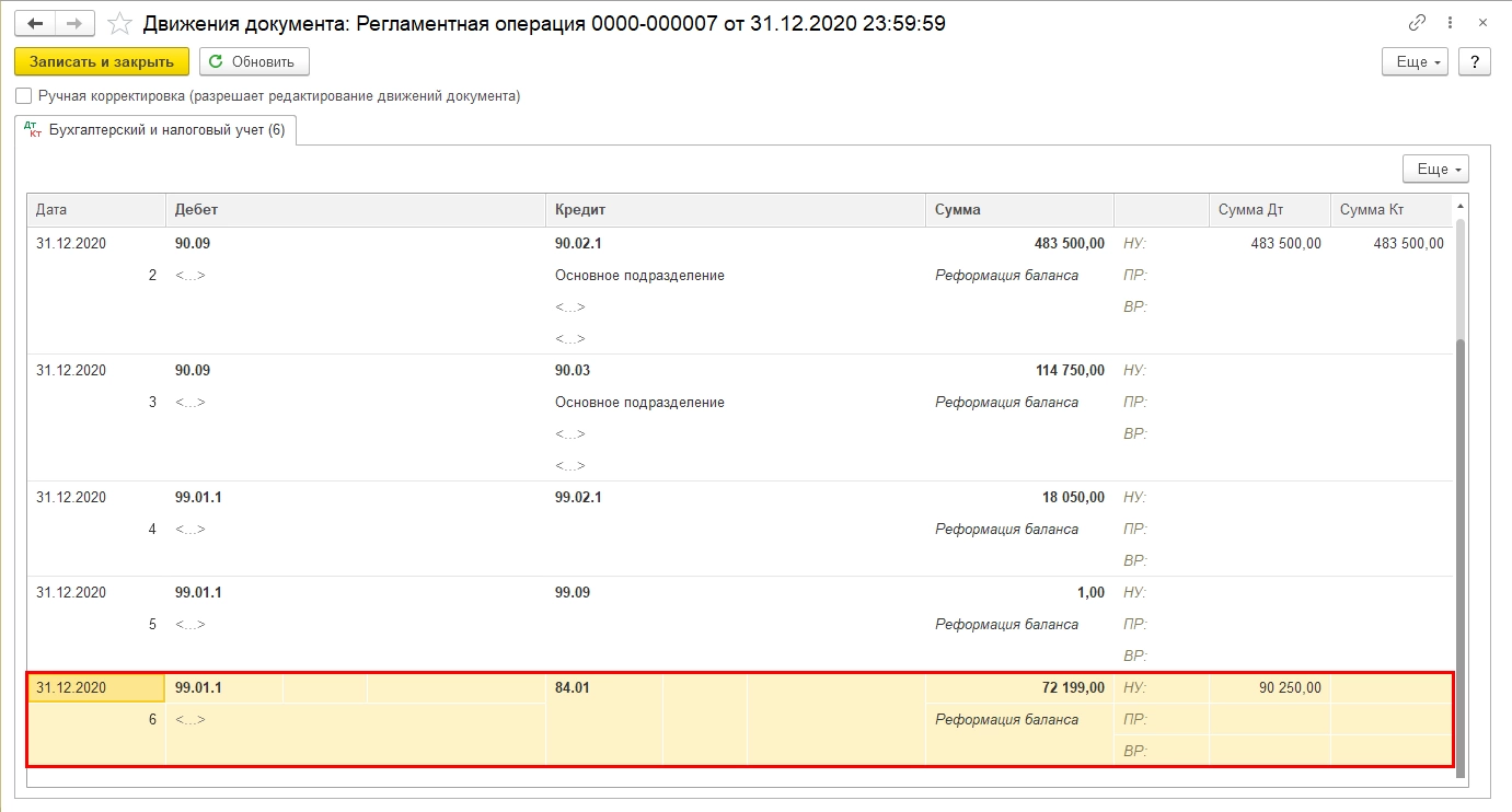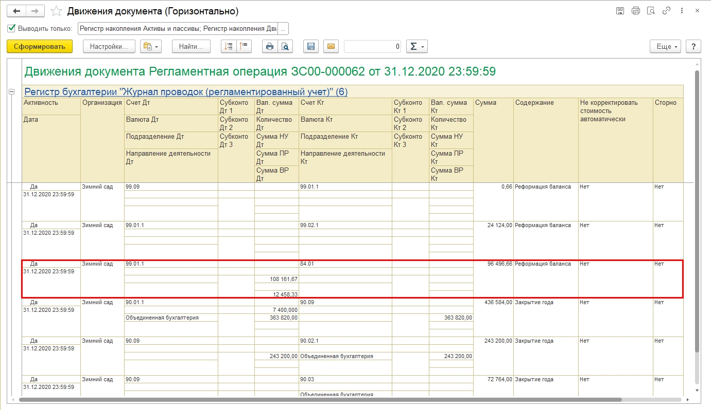 При проведении реформации баланса определяется чистая прибыль предприятия. Запись расчета видно в отчете, отражающем движение документа «Закрытие года»: