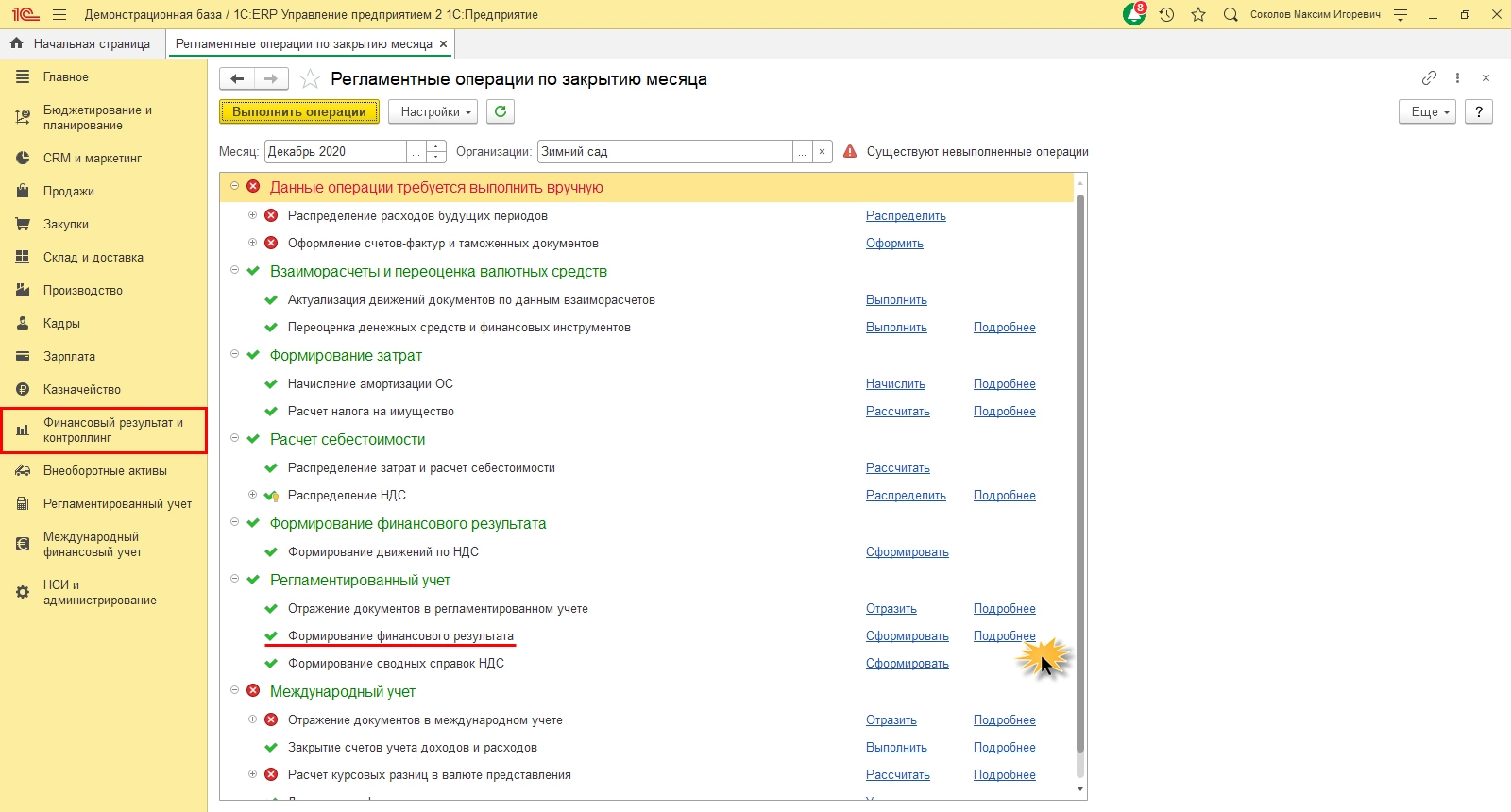 Начнем с того, что по операциям, отображенным в 1С, все доходы и расходы автоматически фиксируются в базе. Перед началом анализа прибыли в 1С:ERP важно запустить регламентную операцию «Закрытие месяца». Чтобы сделать это, перейдем в раздел «Финансовый результат и контроллинг».