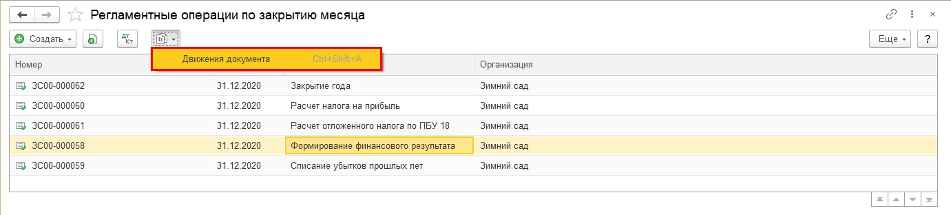 В открывшемся журнале «Регламентные операции по закрытию месяца» выделяем документ «Формирование финансового результата» и, нажав кнопку «Отчеты» или комбинацию клавиш Ctrl+Shift+A на клавиатуре, выбираем команду «Движения документа».