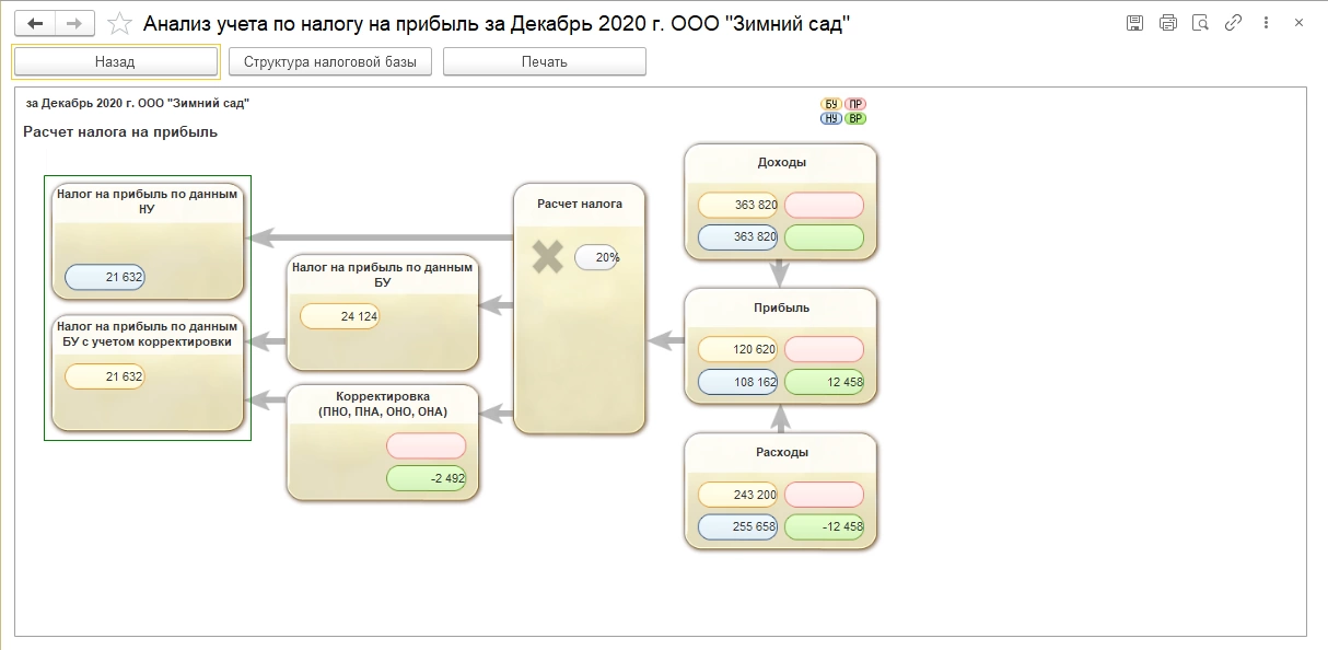 Показатель чистой прибыли ООО «Зимний сад» за декабрь 2020 года по данным бухгалтерского учета составила 96.496 руб. (120.620 руб. – 24.124 руб.).