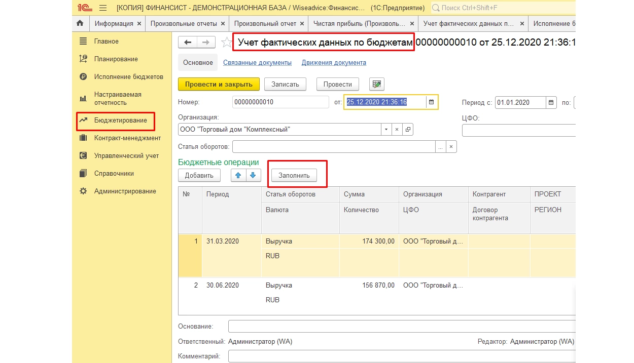 В блоке «Бюджетирование» создадим документ «Учет фактических данных по бюджетам» и заполним его по преднастроенным источникам.
