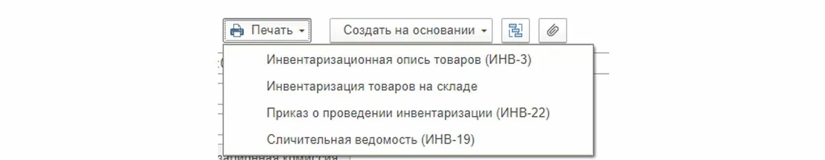 Документ не сформировал никаких движений, так как движения по регистрам и счетам будут сделаны документами оприходования и списания. Однако из созданной «Инвентаризации» можно распечатать различные сопутствующие печатные формы: