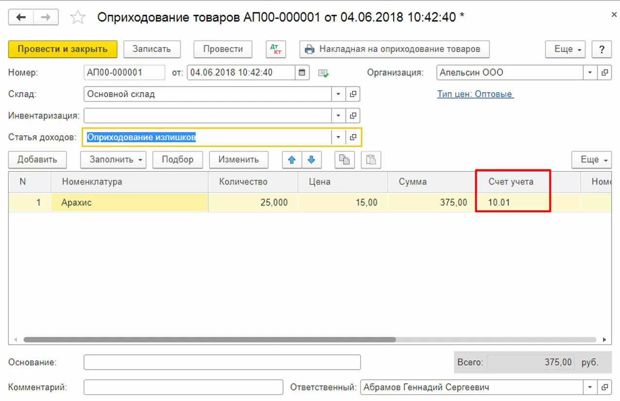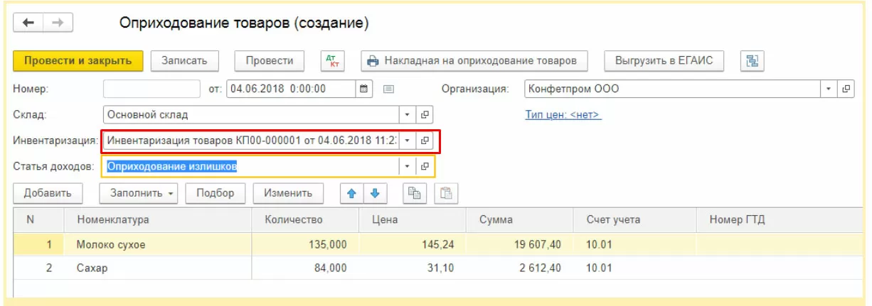 Создавать документ инвентаризации необязательно, можно в новом документе, указав статью «Оприходование излишков», подобрать и заполнить товар вручную, а также его количество, цену и указать счет материалов.