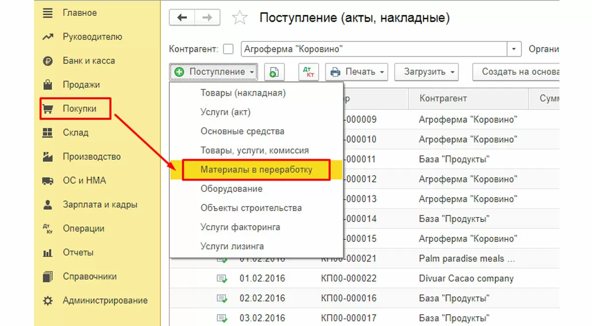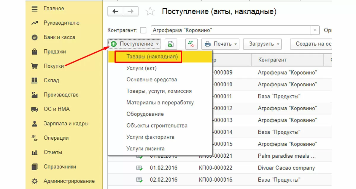 Материал может поступать на склад при покупке у поставщика и в этом случае он учитывается через «Поступление товаров», открывающееся через «Покупки-Поступление (акты, накладные)». В списке документов по кнопке «Поступление» выбираем «Товары (накладная)».