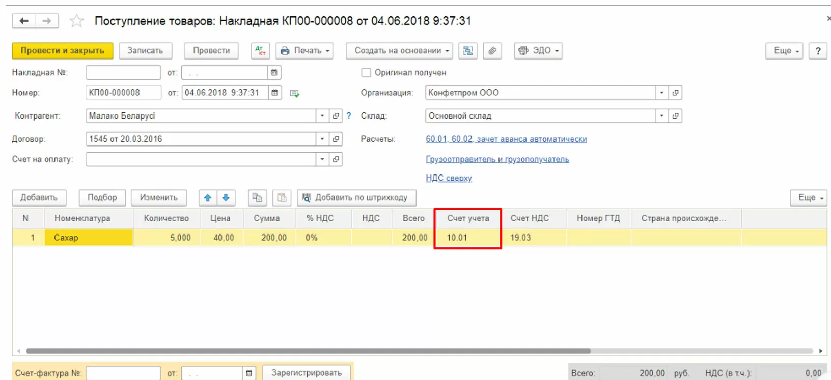 При заполнении документа обязательно указывается организация, счет учета материалов, склад, на который они приходуются, их количество и стоимость.