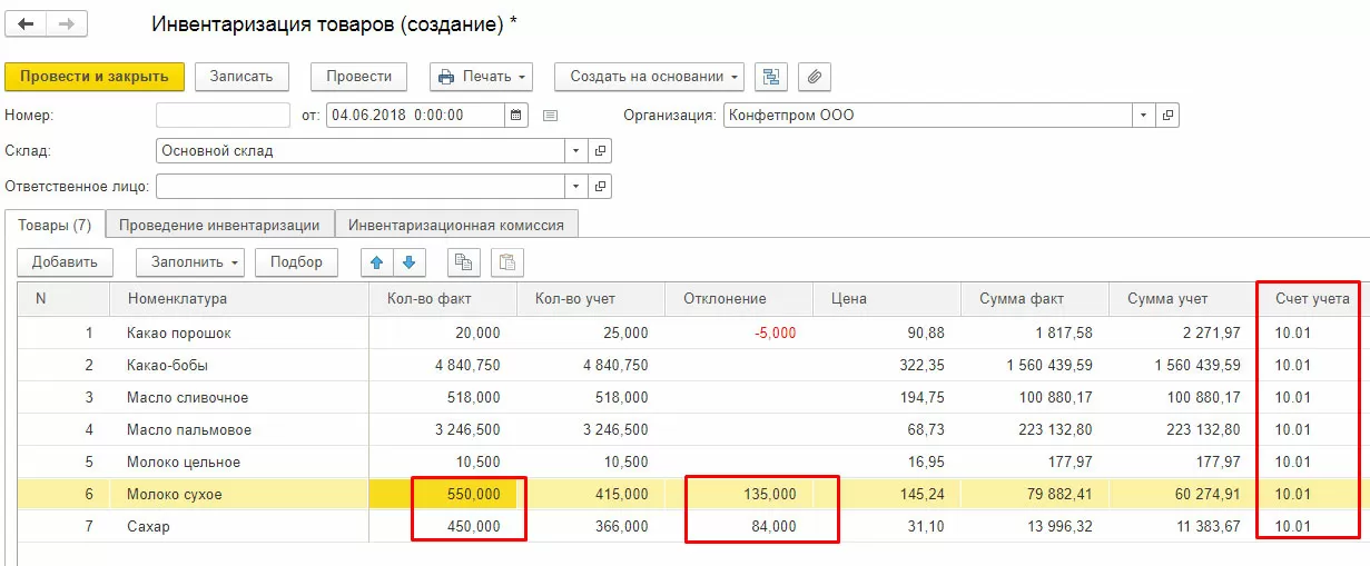 В столбце «Кол-во факт» указываем фактическое наличие материалов на складе. Если обнаружены недостачи, то отклонение будет со знаком минус, если найден излишек, то в столбце «Отклонение» будут положительные суммы. При этом счет учета должен быть 10.