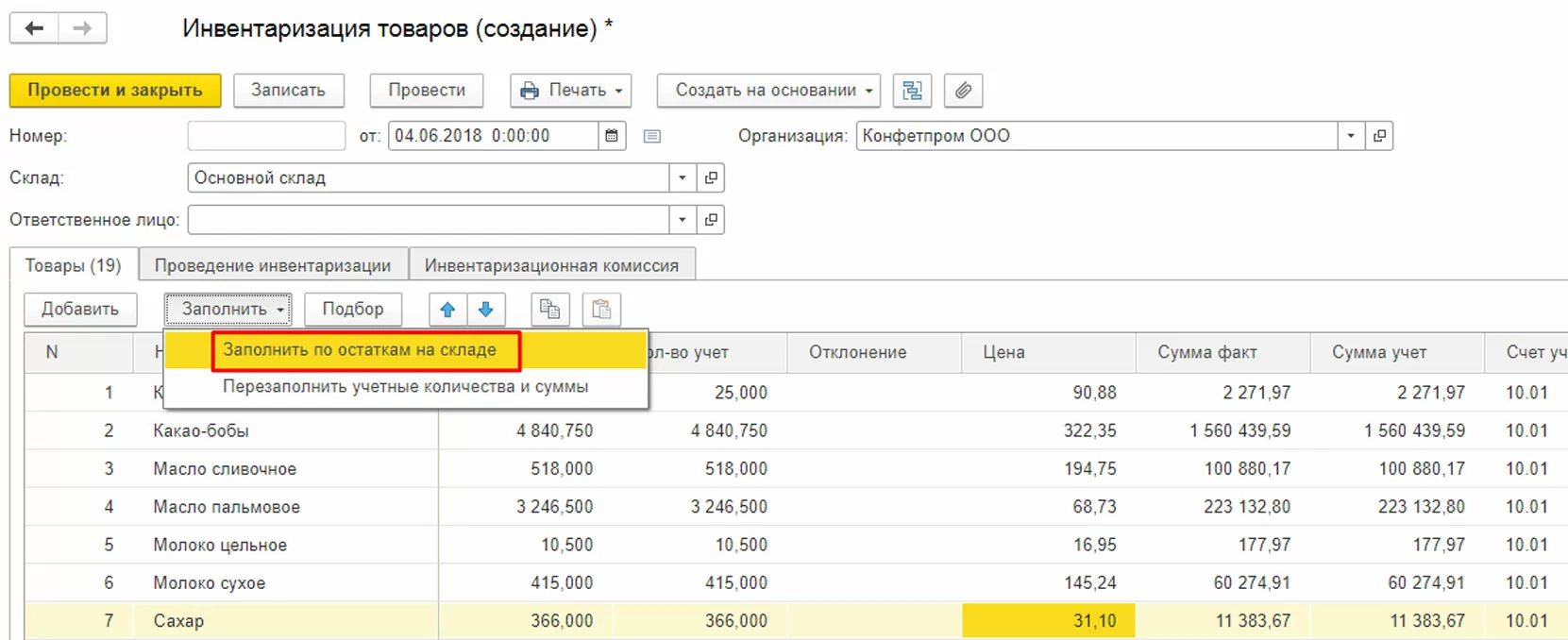 Однако правильнее все же сделать это. При создании документа табличную часть можно заполнить автоматом, нажав «Заполнить по остаткам на складе». Туда попадут все товары с остатками.