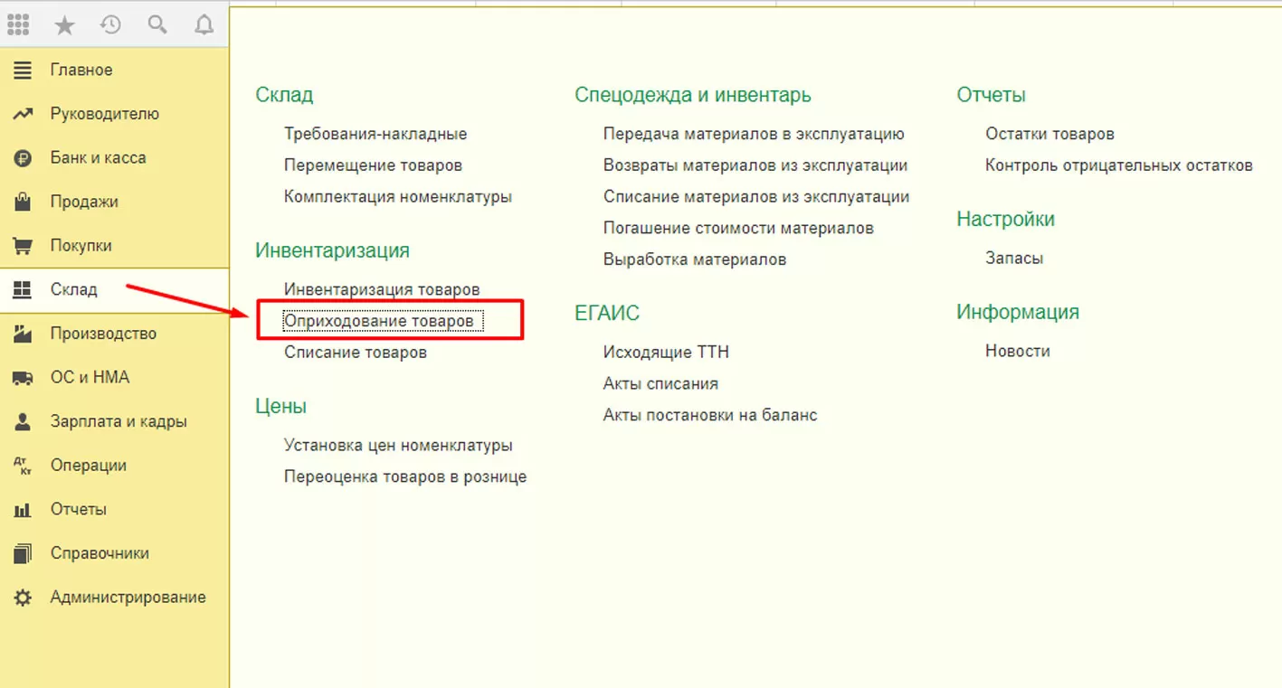 Оприходование материалов в 1C 8.3 можно произвести через «Оприходование товаров-Склад».