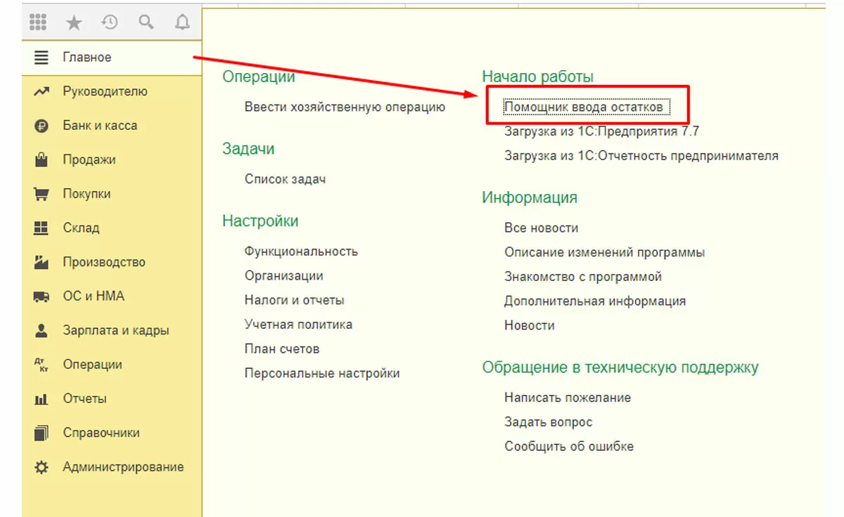 Выбирается требуемый раздел учета, в котором будут созданы нужные нам документы ввода остатков.