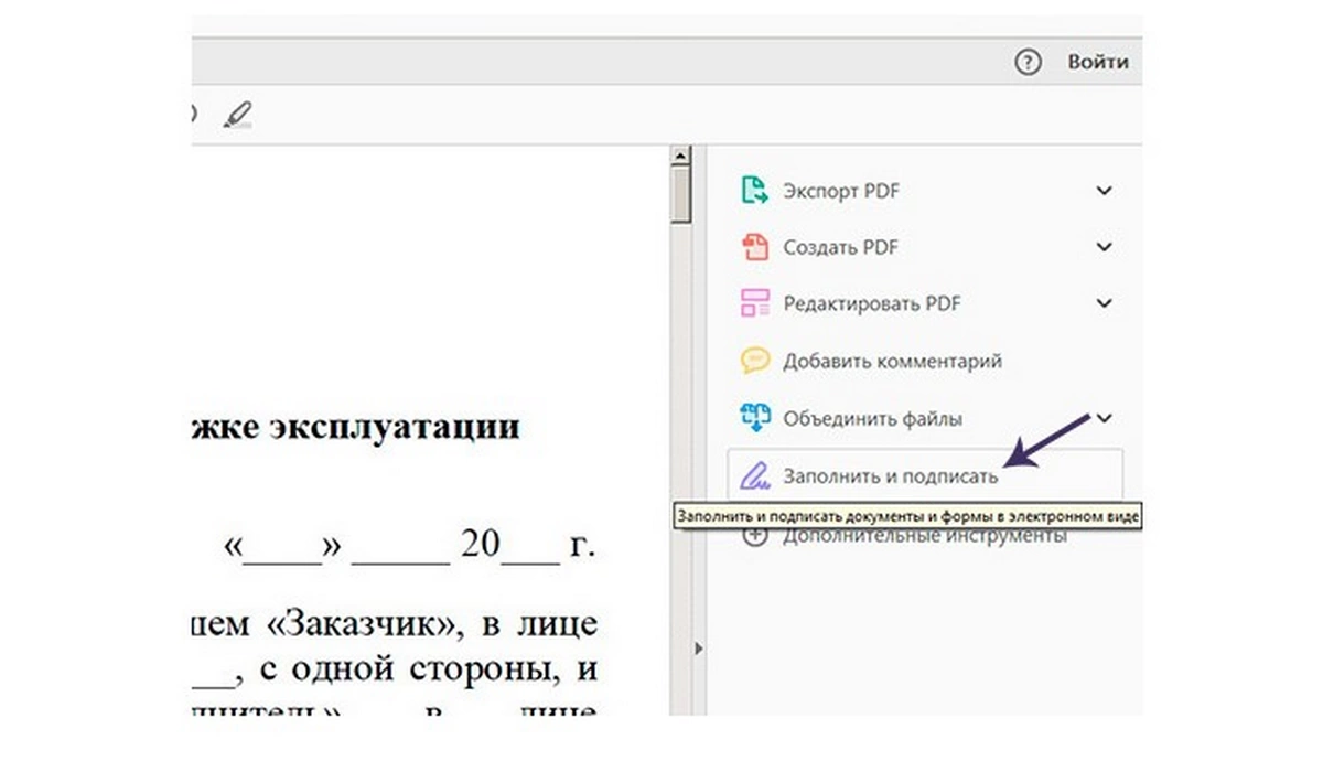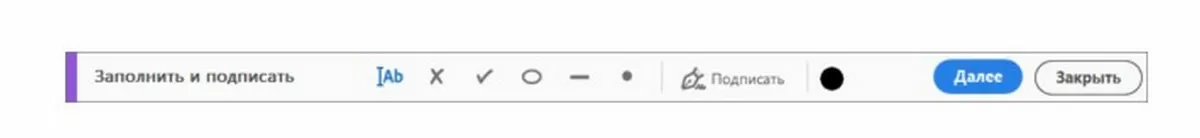 Если вы используете Adobe, в надстройке меню выберите пункт «Заполнить и подписать» и нажмите «Далее».