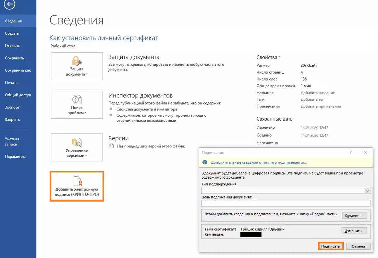 Функция «Подписать документ» в Word-файле не дает создавать ЭП, которая придавала бы такому документу правовую силу. Для этого нужно обязательно интегрировать на ПК специальное программное средство – KриптоПро.