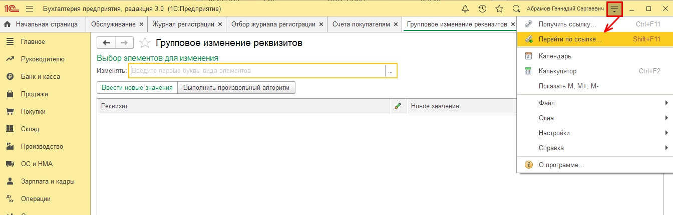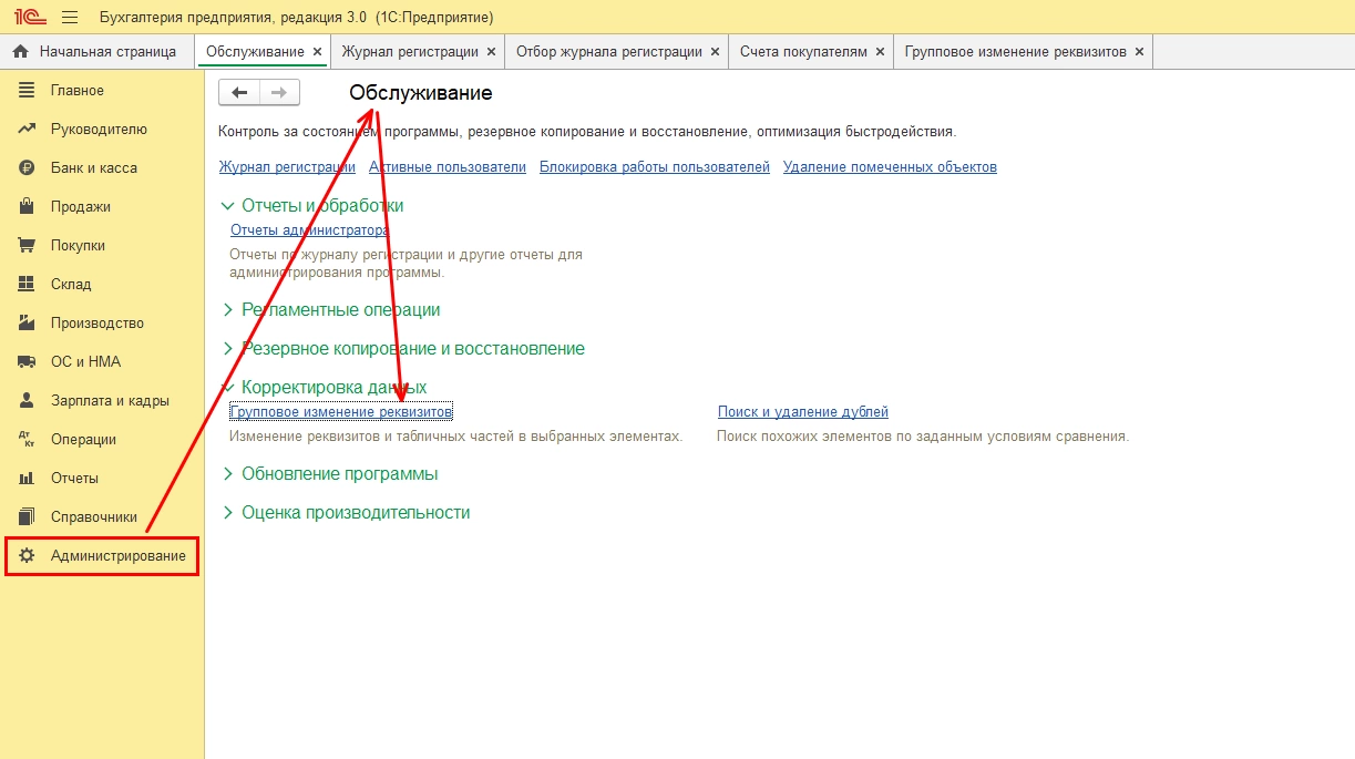 …или использовать стандартный переход по меню панели разделов «Администрирование-Обслуживание-Корректировка данных-Групповое изменение реквизитов».