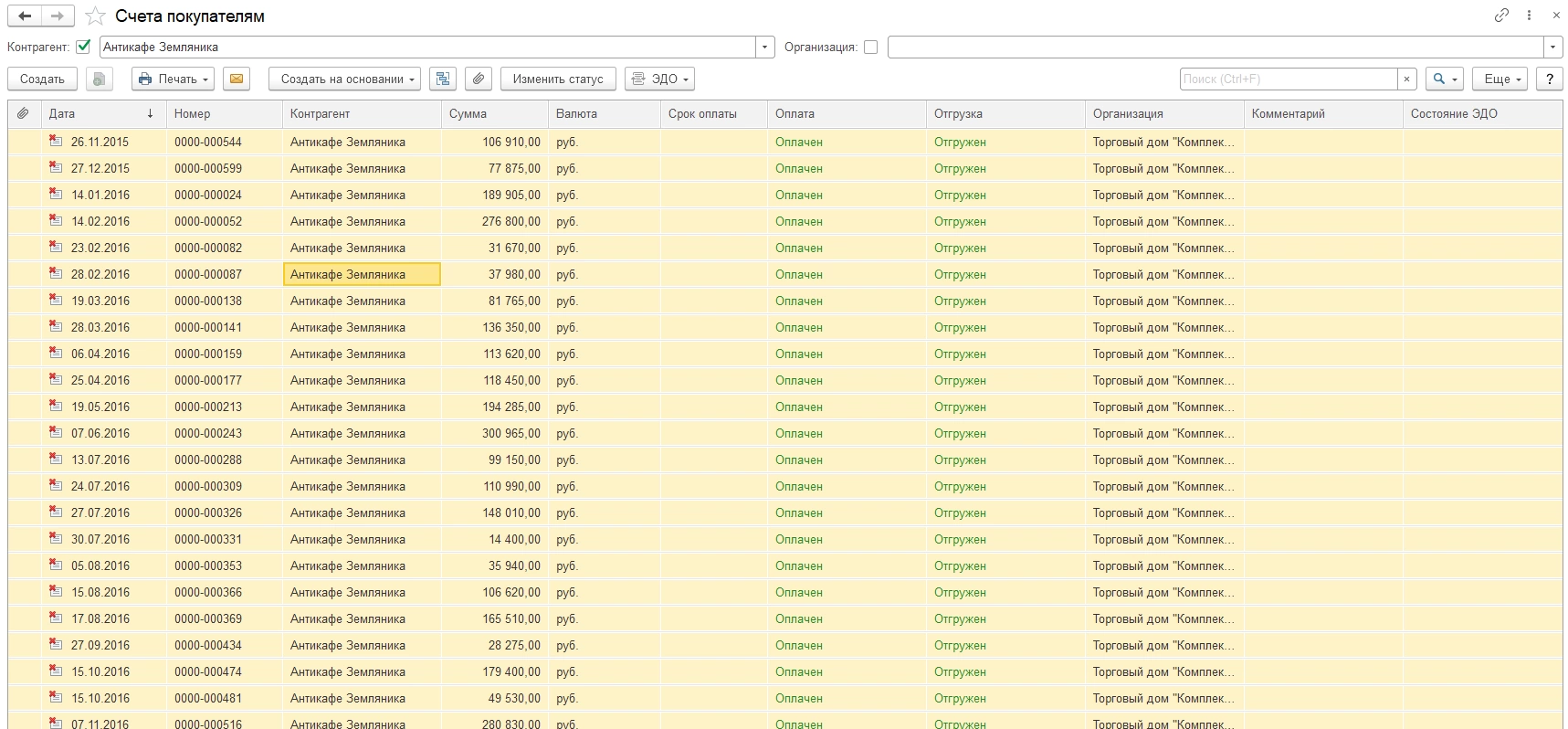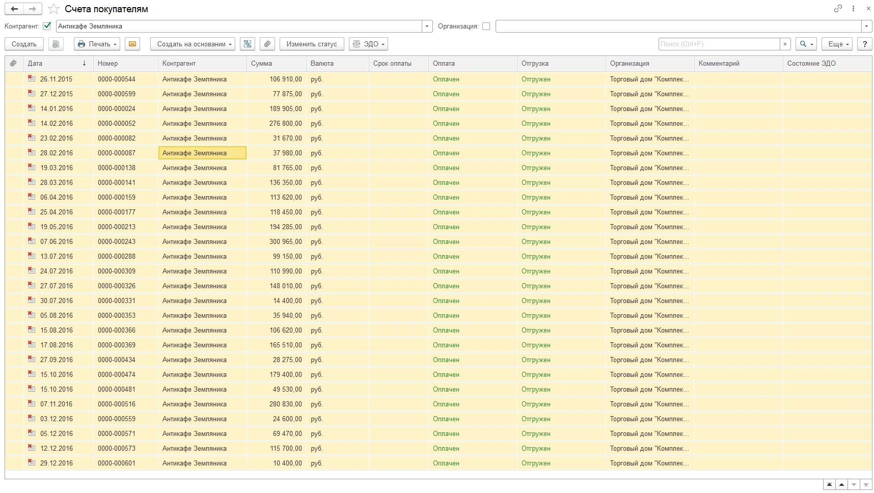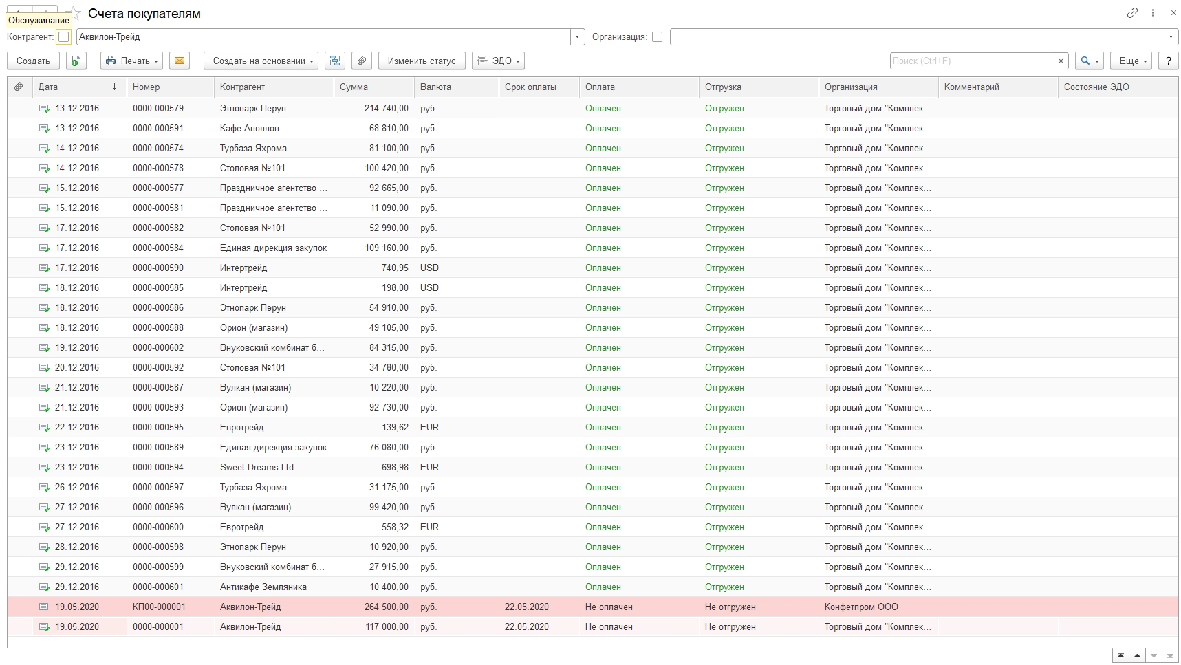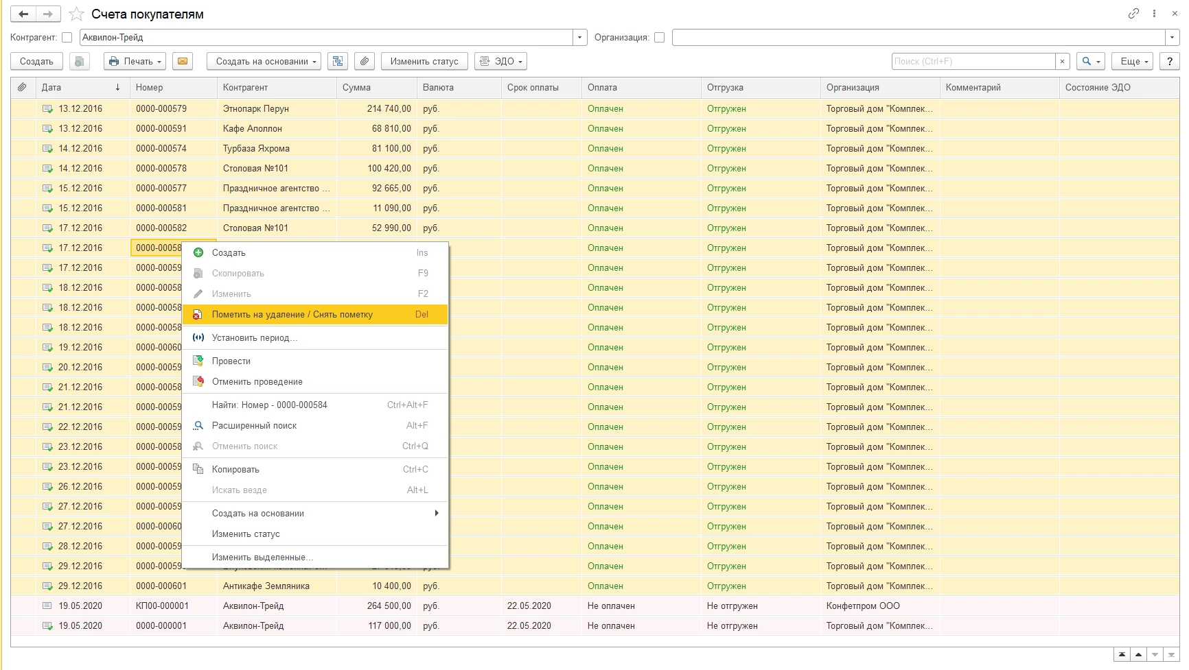 При необходимости можно проверить результат, перейдя в журнал счетов покупателям. Обратите внимание, что перед пометкой на удаление документы нужно будет распровести, а также на наличие связанных объектов.