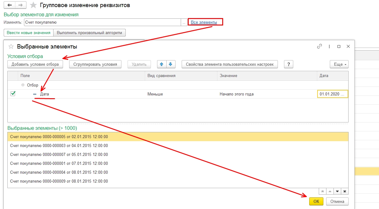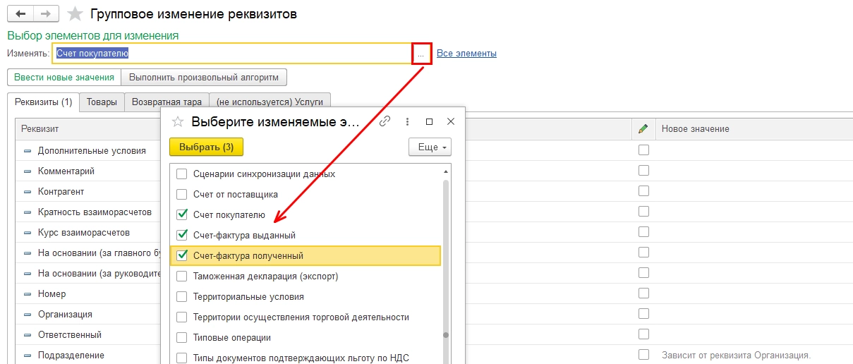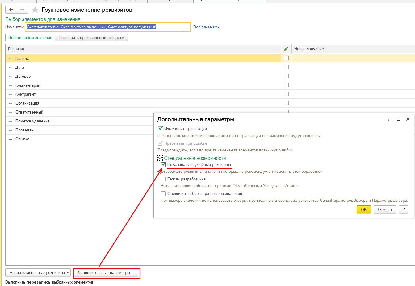 Мы можем задать несколько типов объектов, чтобы менять только общие для этих объектов реквизиты. Если нужно, мы можем установить отбор для документов (например, ограничить группу документов датой). Отобранные объекты отображаются в подвале открытого окна.