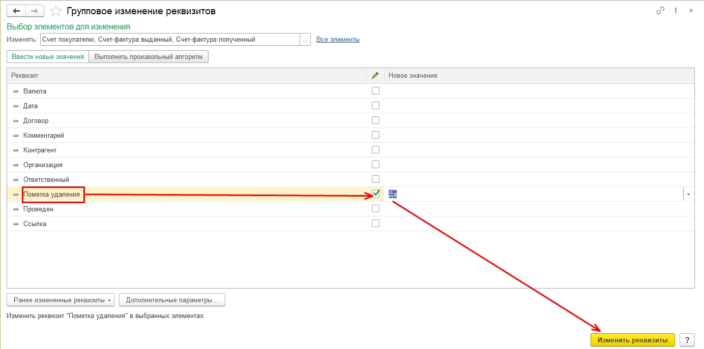 Установка пометки на удаление с помощью группового изменения реквизитов
