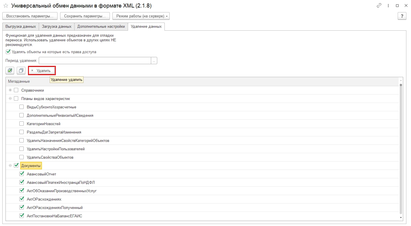 Эта обработка предназначена для обмена данными, но в ней имеется закладка «Удаление данных». Хотя разработчики предупреждают, что использовать ее не рекомендуется, т.к. может нарушиться ссылочная целостность информации, ею мы воспользуемся, т.к. нам она нужна именно для полной очистки информационной базы. Устанавливаем галочку, что удалять мы будем все документы.