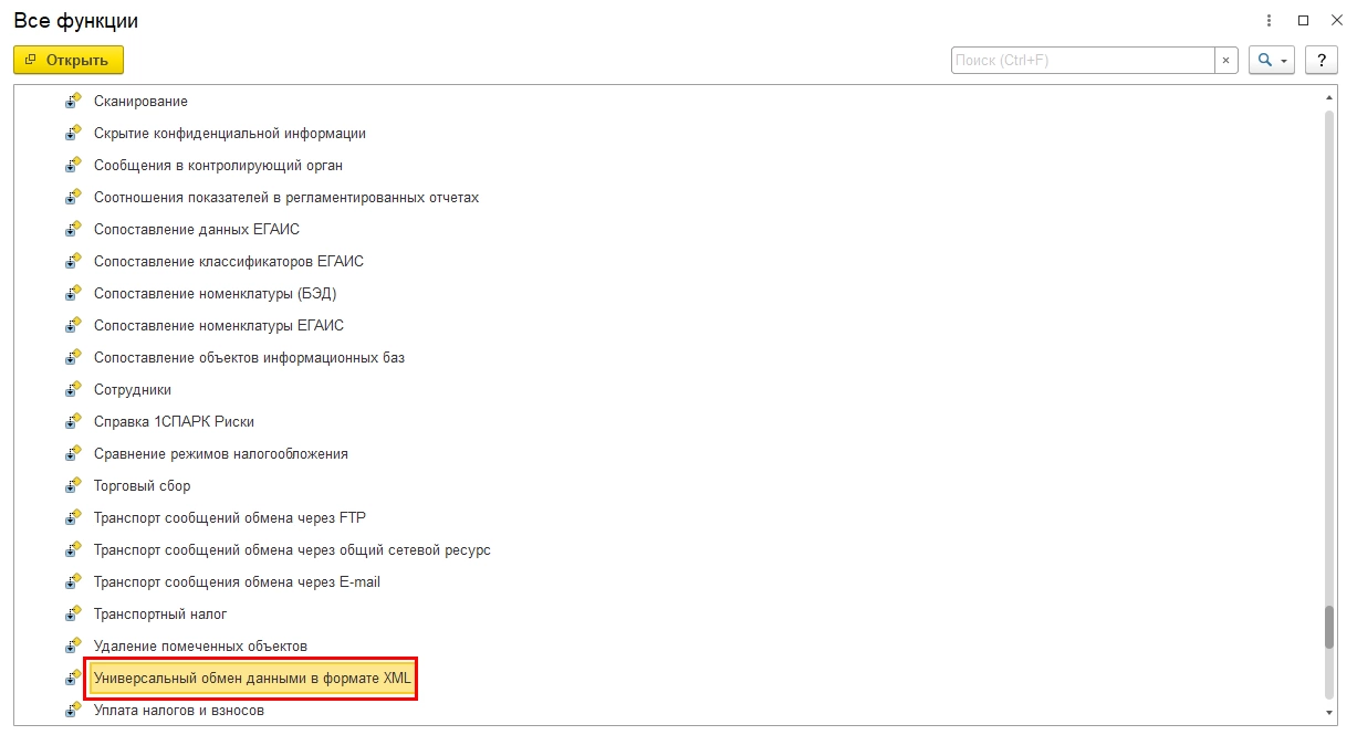 Этот способ хорошо использовать, когда надо очистить полностью информационную базу от всех документов. Сделать это можно с помощью обработки «Универсальный обмен данными в формате XML». Найти ее можно в разделе «Все функции»-«Обработки».