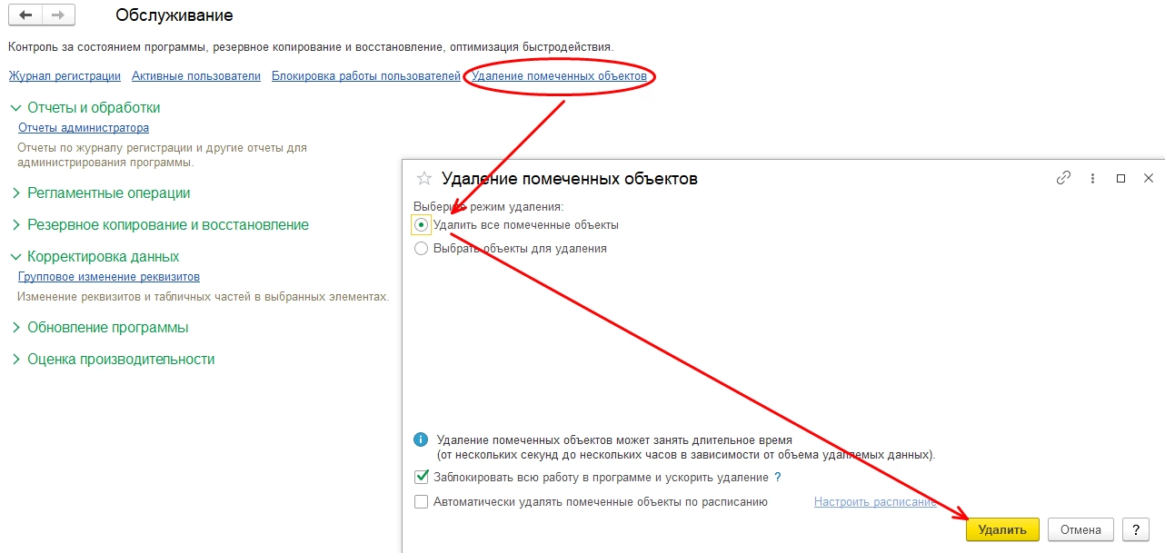 Работая в программах 1С, рекомендуется периодически удалять помеченные объекты. Накапливаясь в программе, они приводят к увеличению информационной базы, снижается быстродействие программы, появляются недочеты в работе пользователя. Ошибки могут возникнуть, если пользователь случайно выберет помеченный на удаление объект, что часто бывает при копировании документов, создании дублей записей и потом установки пометки на удаление на одну из них и т.п. При установлении даты запрета редактирования на определенную дату будет проблемно удалить такие объекты. Поэтому необходимо вовремя освобождать программу от ненужной информации самостоятельно или осуществлять данные действия силами специалистов в рамках сопровождения 1С 8.3.