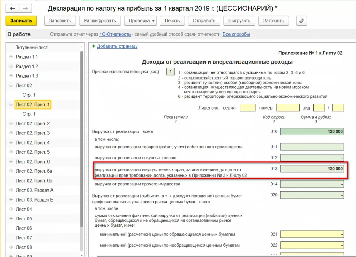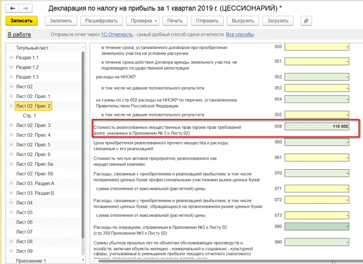 Стоимость реализованных имущественных прав показана отдельной строкой.