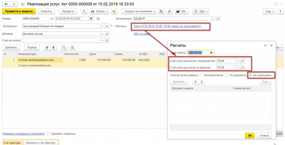 Счета расчетов меняем на 76, способ аванса – Не зачитывать.