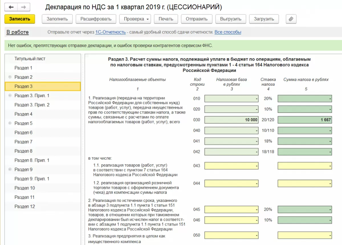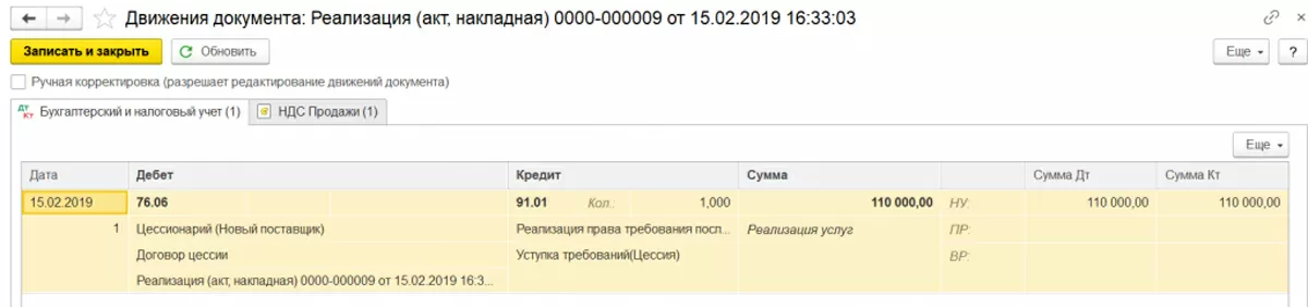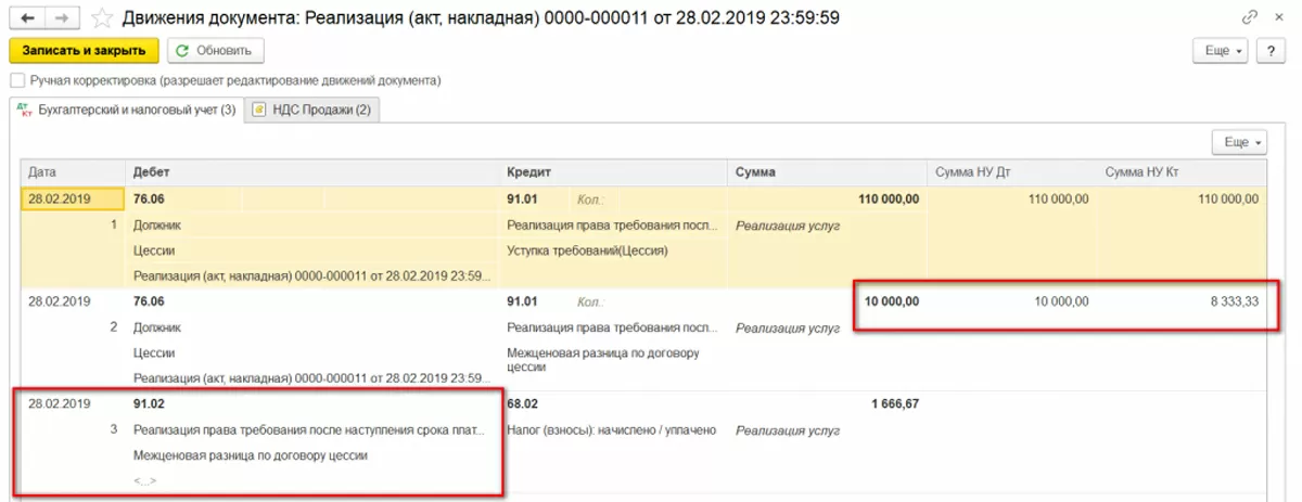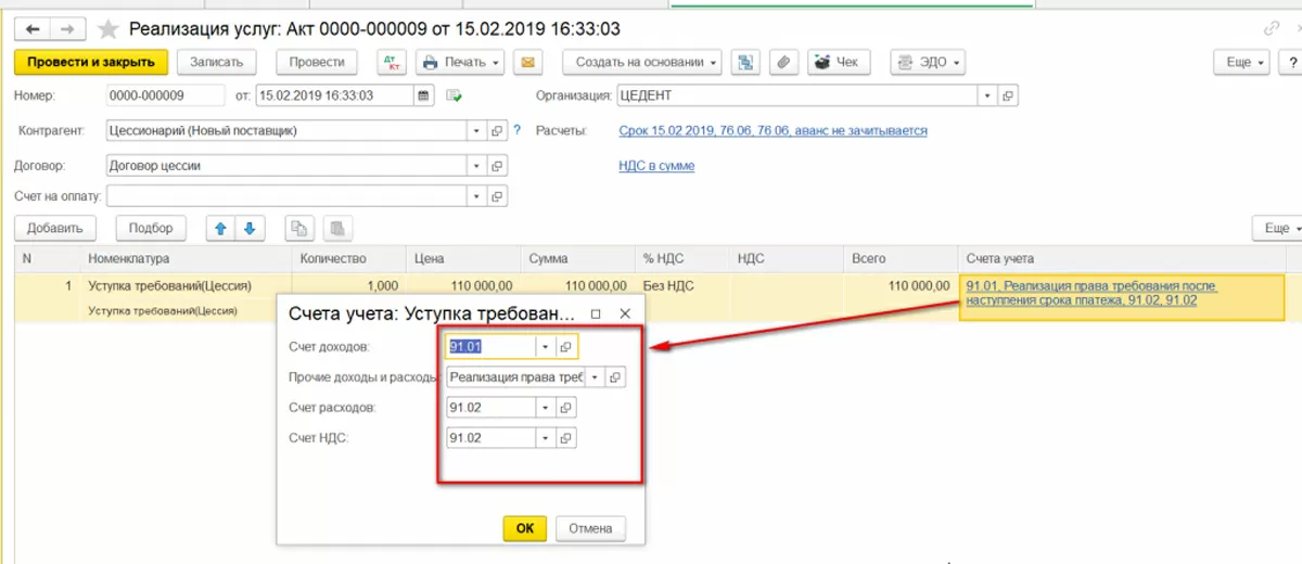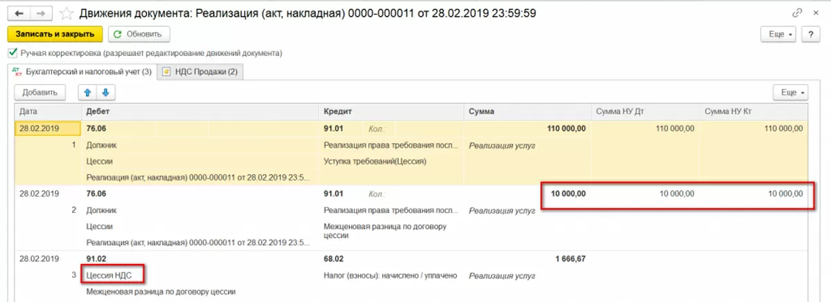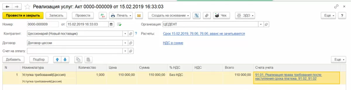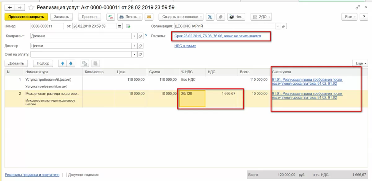 Теперь следует отразить реализацию по договору цессии. И здесь есть ряд методологических и технических вопрос, на которые законодательство не дает ответа. Например, согласно нашему примеру, сумма выручки должна быть 118000 руб., а налоговая база для НДС – 10000, из которой по ставке 18/118 следует «выкрутить» НДС. Как в этом случае правильно оформить документ реализации и счет-фактуру?
