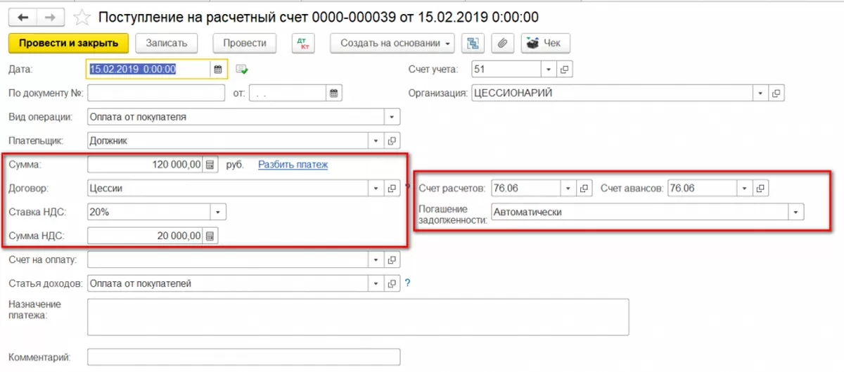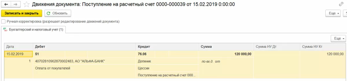 Дт 62 (сальдо по Б) 120000. Проводки по договору цессии: