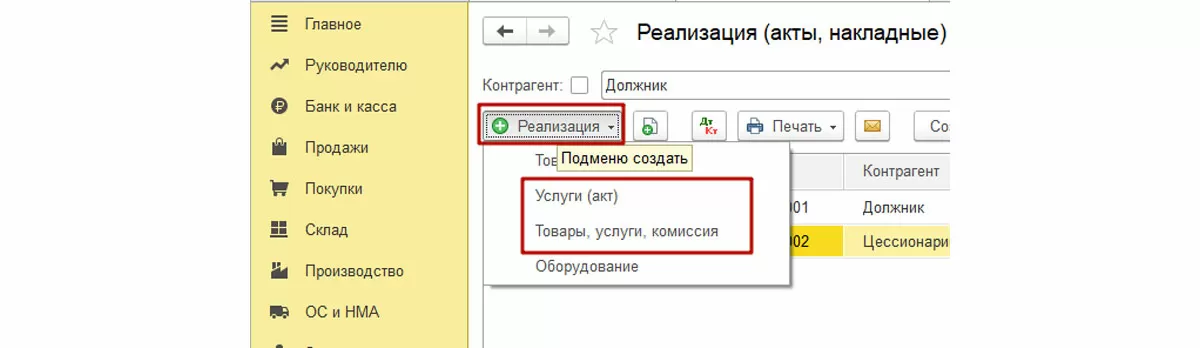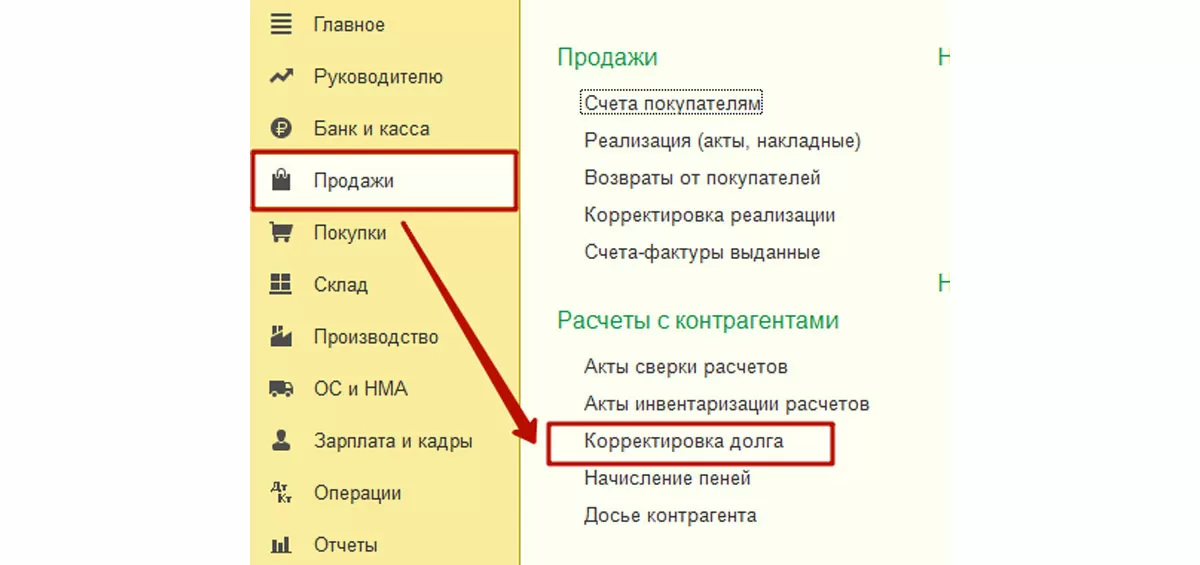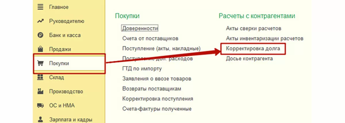 Автоматизацию бухгалтерского учета на предприятии должника, подразумевает следующие действия: получив уведомление о смене кредитора, должник должен перенести сумму задолженности с одного контрагента на другого. Для этого используется документ «Корректировка долга», который может находиться в разделах «Покупки» и «Продажи».