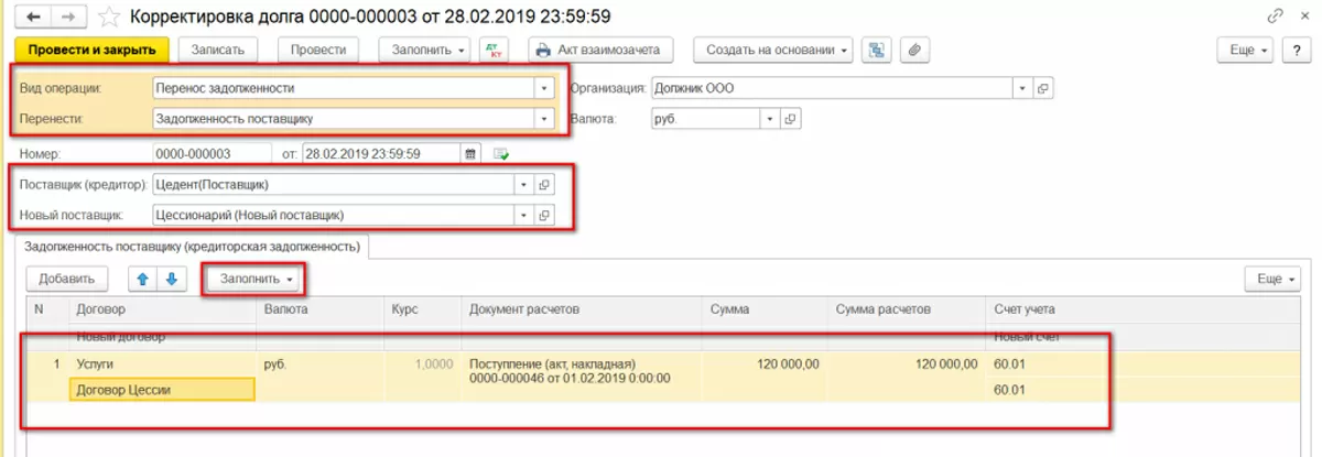 Вид операции – Перенос задолженности; Перенести – Задолженность поставщику.Заполняем из справочника контрагентов данные по кредитору и новому поставщику.