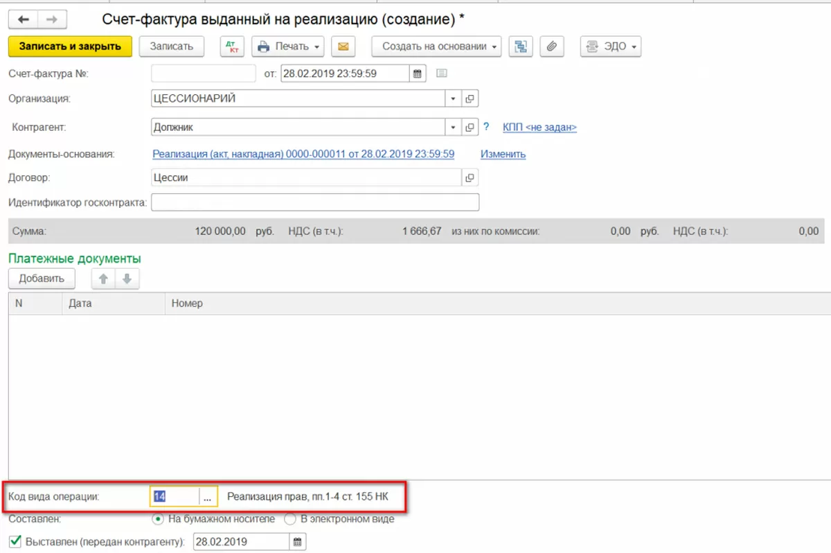 На основании реализации создаем счет-фактуру. По коду вида операции из справочника выбираем значение, связанное с реализацией прав.