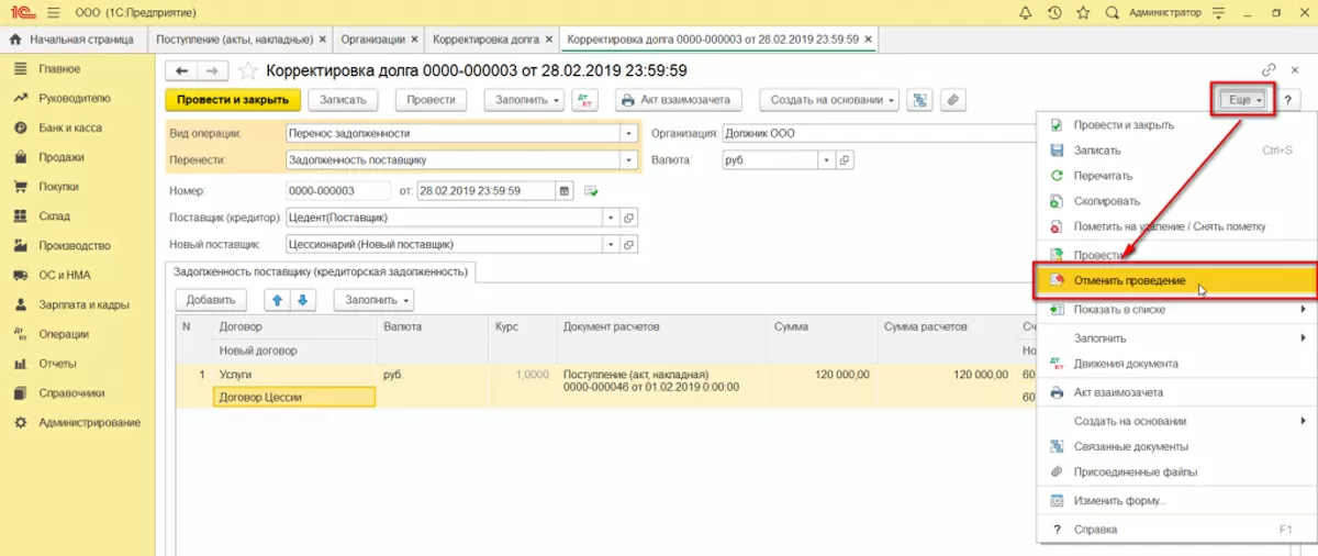 Иногда возникает необходимость переформировать документ, но возникает ошибка – предлагается предварительно его разутвердить. Здесь можно воспользоваться вариантом меню по кнопке «Еще».