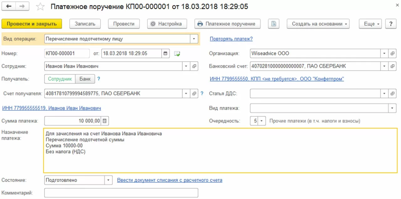 - Документом «Платежное поручение» с видом операции «Перечисление подотчетному лицу»;