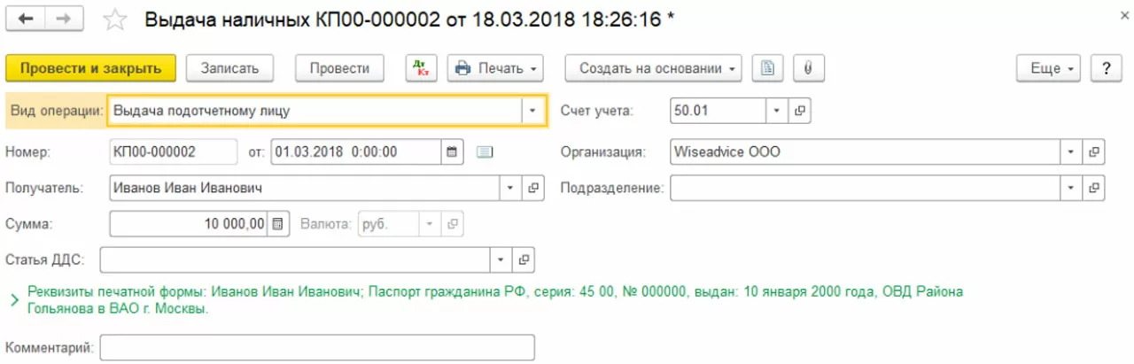 Выдача денежных средств на сумму перерасхода ничем не отличается от рассмотренной выше операции первичной выдачи средств сотруднику. Единственное, на что нужно обратить внимание – чтобы денежные средства выдавались от имени той же организации и тому же сотруднику, по которым был оформлен авансовый отчет на сумму перерасхода.
