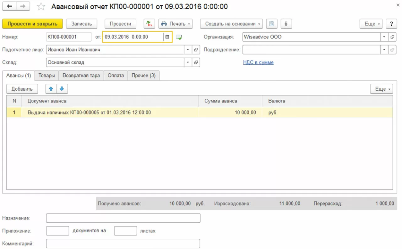 Авансовые отчеты оформляются отдельным документом, которым можно оформить как поступление товаров или оплату поставщику за товары и услуги, так и специфические операции, например, оплату налогов или командировочные расходы.