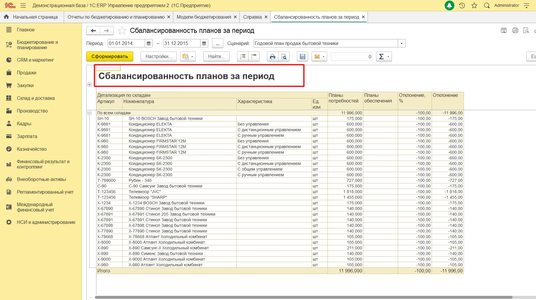 Здесь же есть несколько типовых отчетов, из которых можно извлечь данные для прогнозирования прибыли, и проанализировав их, создать прогноз на необходимый период. Это такие отчеты, как «Исполнение планов продаж и закупок». Проверить как планы сочетаются между собой можно при помощи отчета «Сбалансированность планов».
