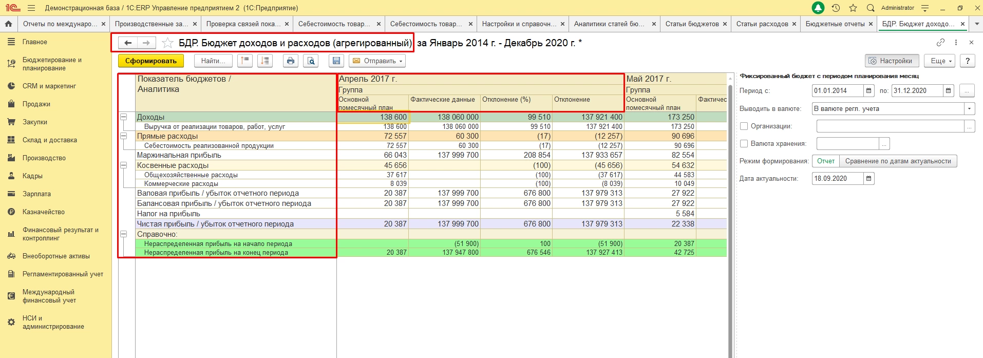 Отметим важное преимущество ведения учета и контроля данных при помощи 1С: план-фактный анализ прогнозируемой прибыли в программных продуктах, о которых речь идет в данной статье, можно проводить в любой момент времени (естественно, при наличии актуальных данных в базах) в независимости от закрытия периода, то есть на различных этапах планирования и вообще – в любой момент времени. Например, при помощи отчета «Бюджет доходов и расходов».