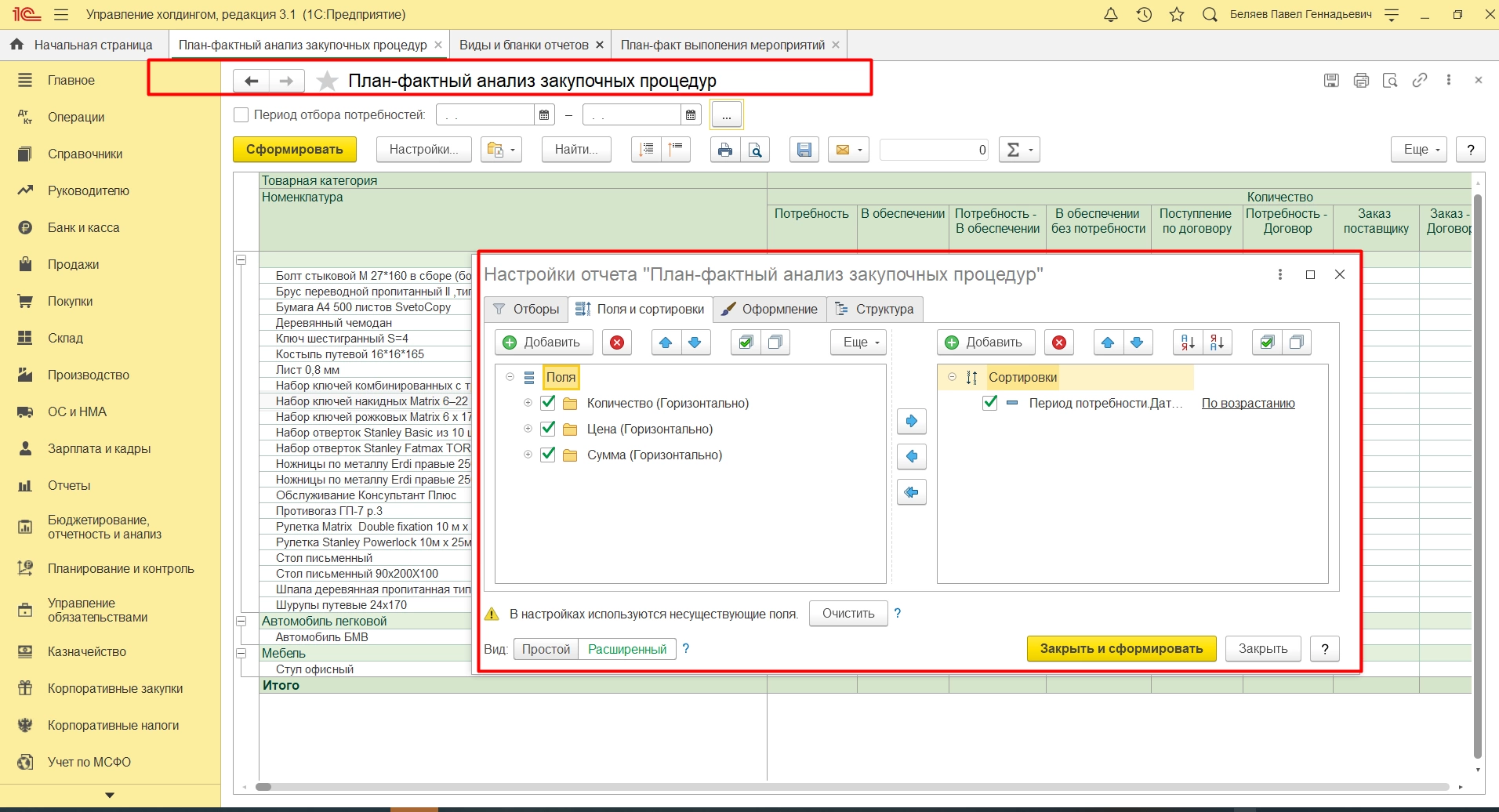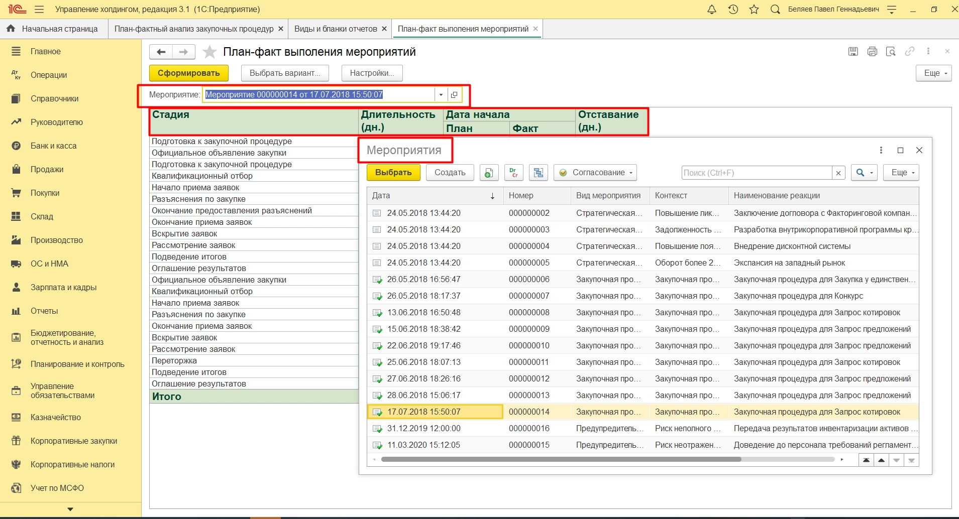 План-фактный контроль в данном программном продукте можно также проводить в любой момент времени, на любых этапах жизнедеятельности организаций, например, на этапе закупочных процедур, на основании данных, которые были внесены в программу пользователями или получены посредством интеграции из других источников. С помощью план-фактного отчета по закупочным процедурам можно проанализировать количество, цену, сумму сделки и т.д.