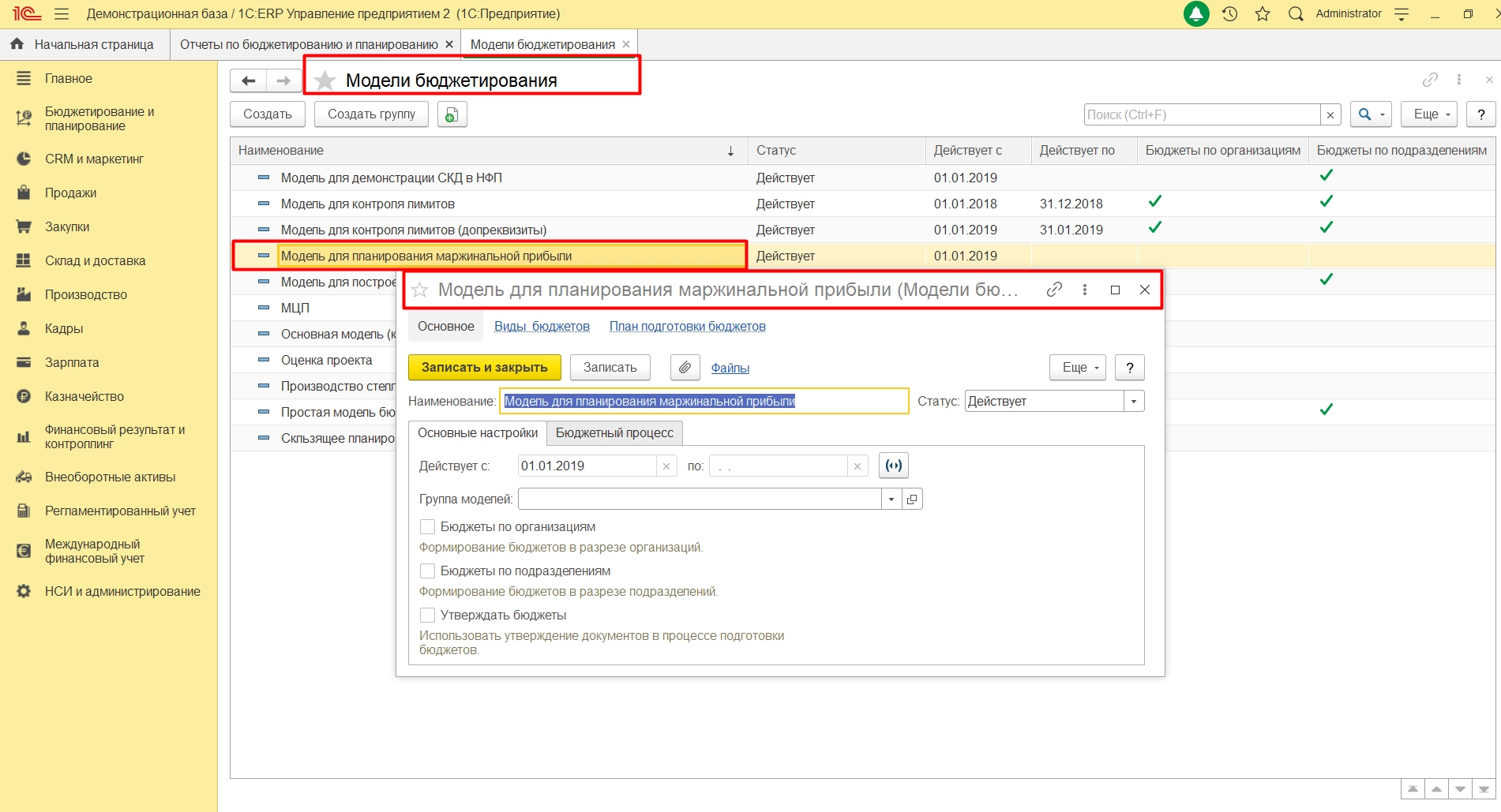 Для прогнозирования прибыли в 1С:ERP можно воспользоваться справочником «Модели бюджетирования». Этот справочник предназначен для регистрации и настройки любых моделей бюджетирования для прогнозирования различных показателей, включая прибыль. Например, «Модель для планирования маржинальной прибыли».